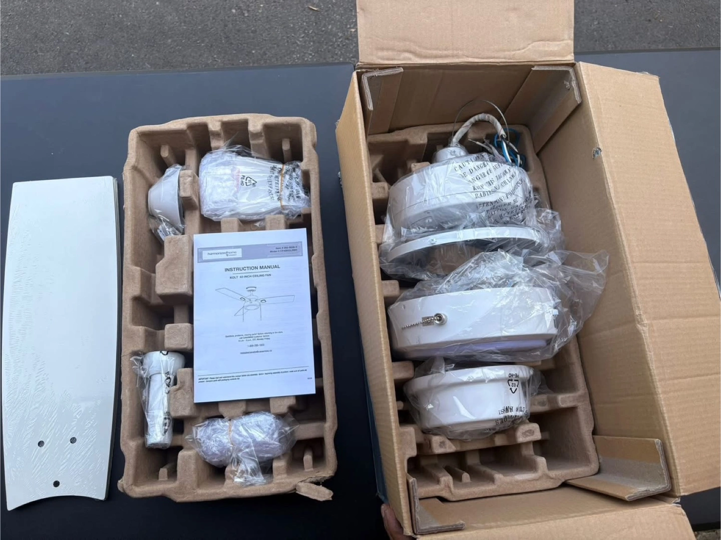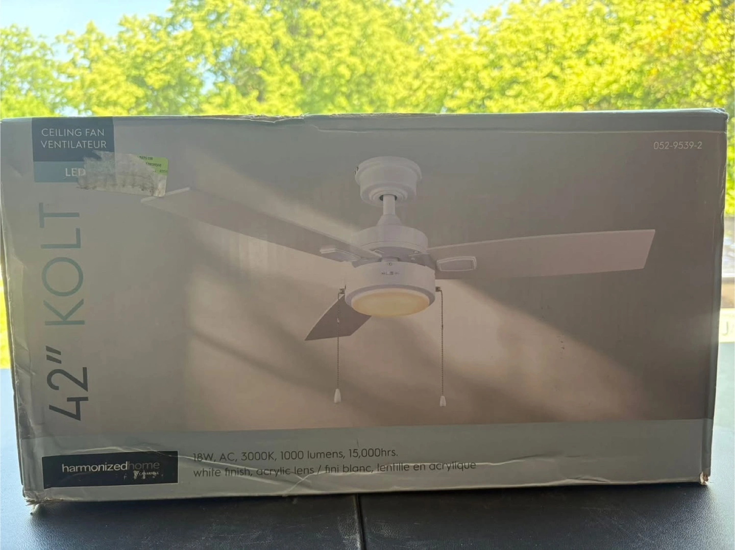 Selling a Harmonized Home 42-inch Kolt LED ceiling fan in white. It's in great condition and comes with the box and all components. This fan features an 18W LED light, operates at AC 3000K, and produces 1000 lumens. Perfect for adding a touch of style and comfort to any room!