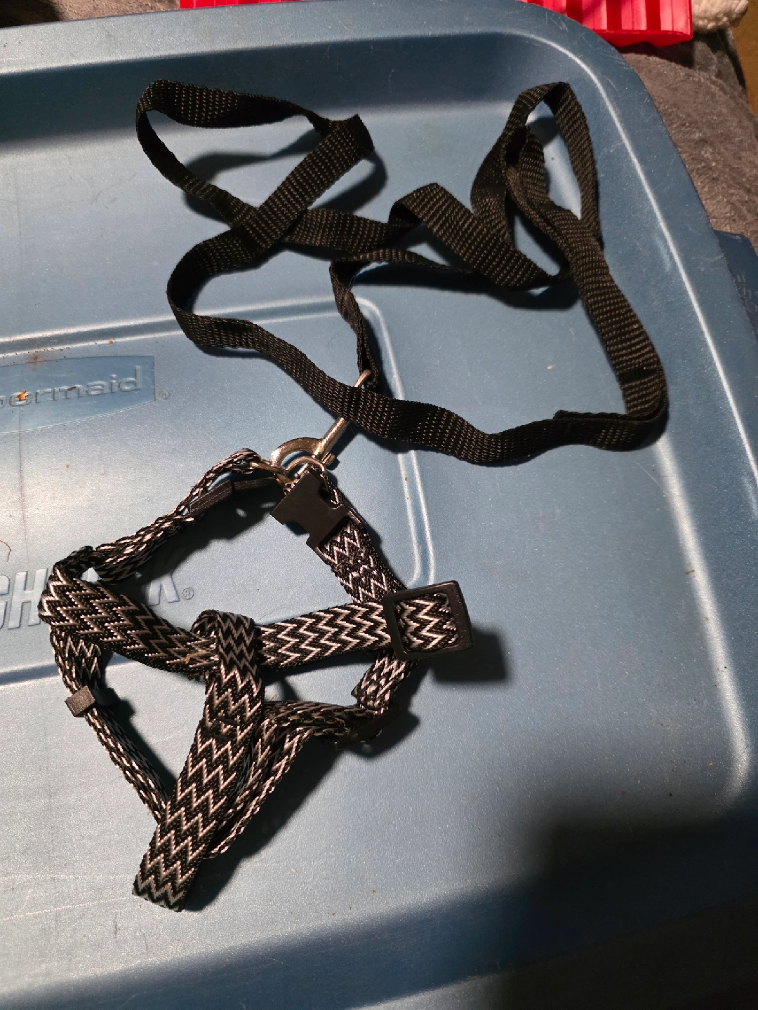 Selling a harness and leash set. The harness is black and white with a zig-zag pattern, and the leash is plain black. Great for walks! Harness never used, leash used a few times but in great condition.