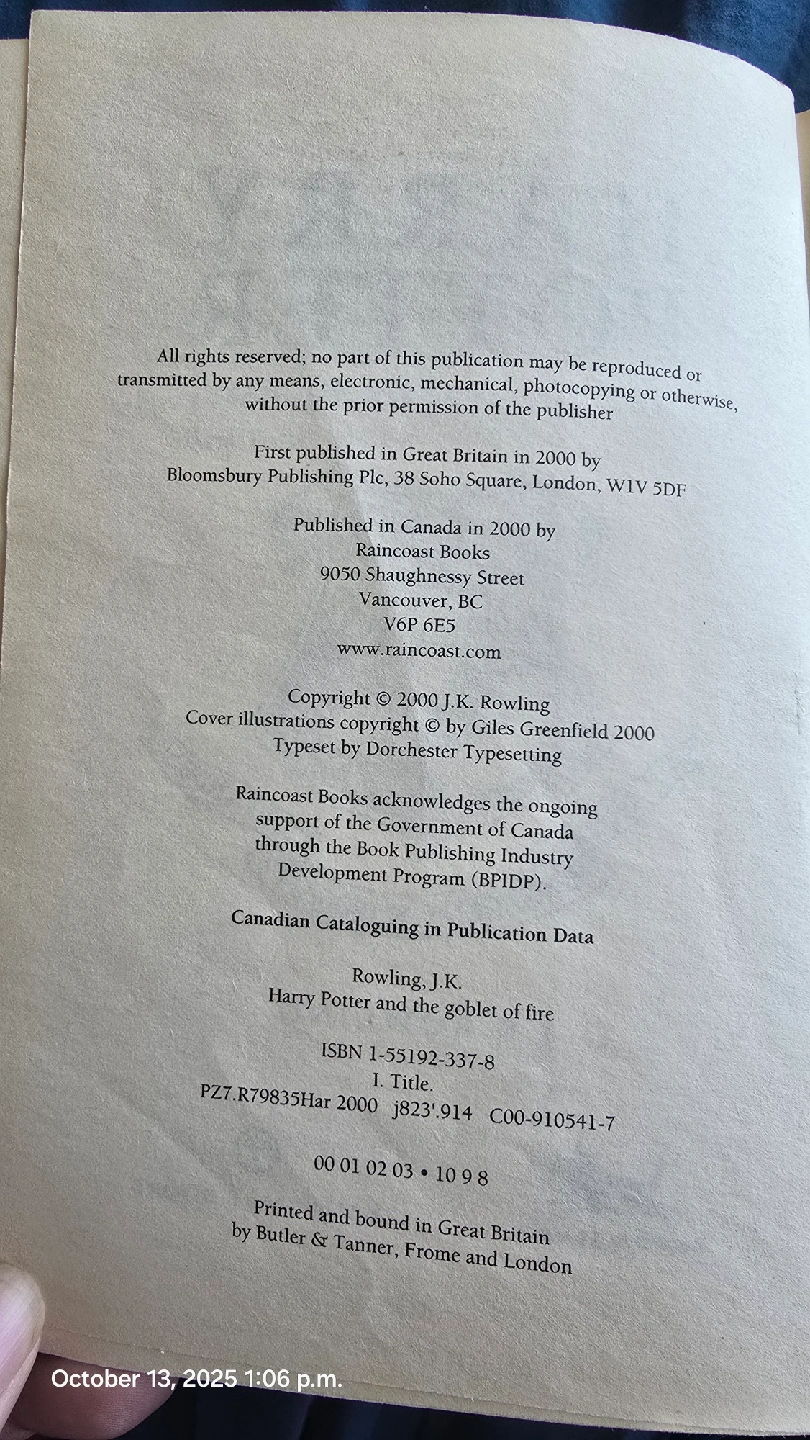 Selling a copy of Harry Potter and the Goblet of Fire by J.K. Rowling! It was first published in Great Britain and Canada in 2000. A great addition to any book collection! I know it's the high price but yes it's been used but it's still first edition like I showed you otherwise let me know. selling it immediately right now will accept cash