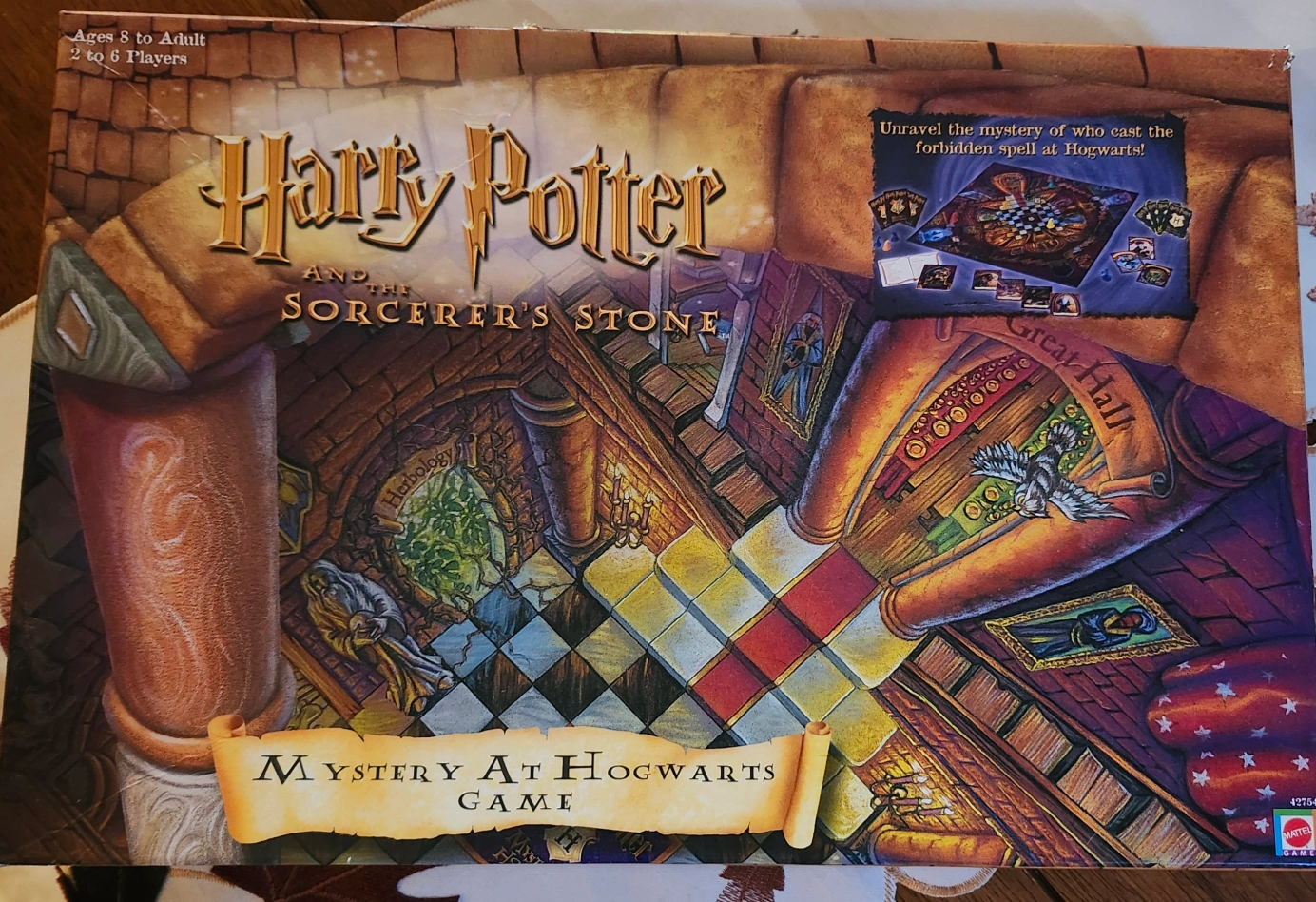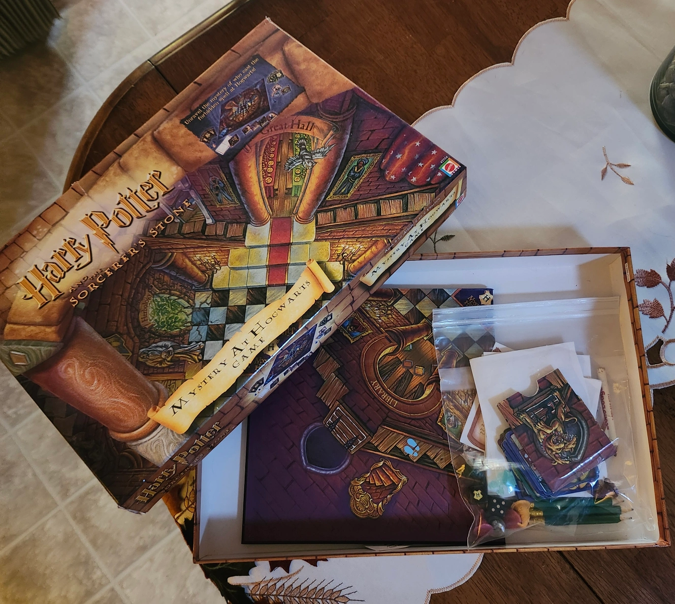 Selling the Harry Potter and the Sorcerer's Stone Mystery at Hogwarts game! It's suitable for ages 8 to adult, and for 2 to 6 players. All the pieces are included, and the box is in great shape!
