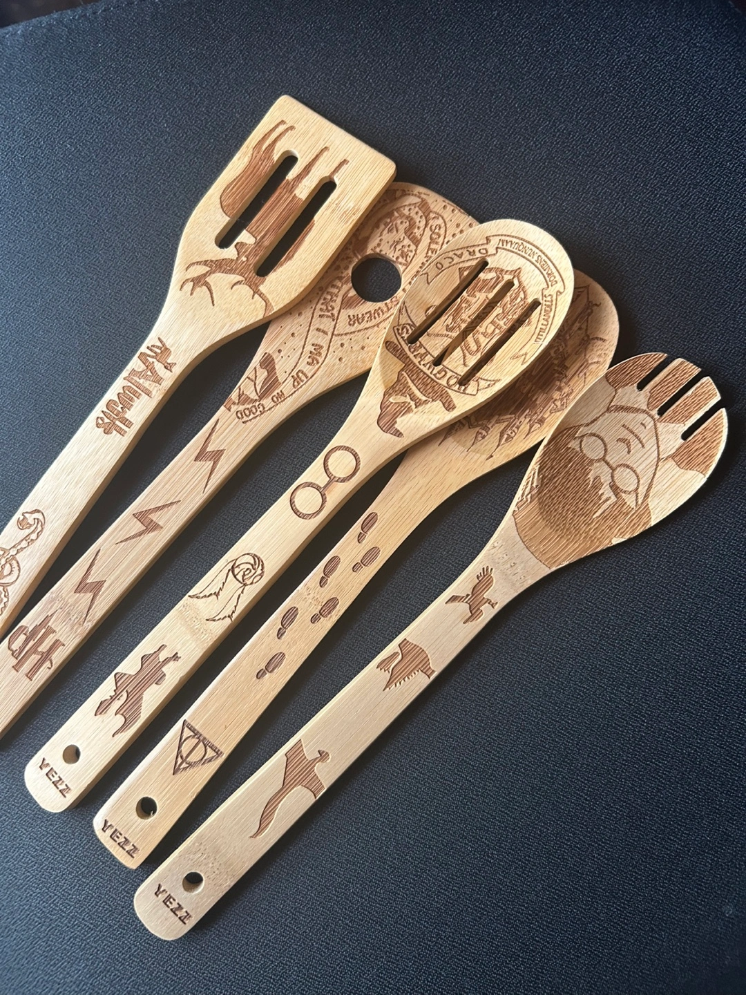 A set of wooden kitchen utensils. Featuring harry potter imagery. The utensils would be a perfect addition to any kitchen or makes a great gift.. Never used