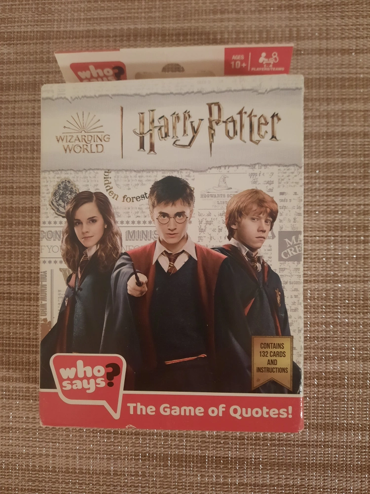 Selling a Harry Potter themed card game called 'Who Says? The Game of Quotes!' It is suitable for ages 10+ and for 2-8 players. Contains 132 cards and instructions