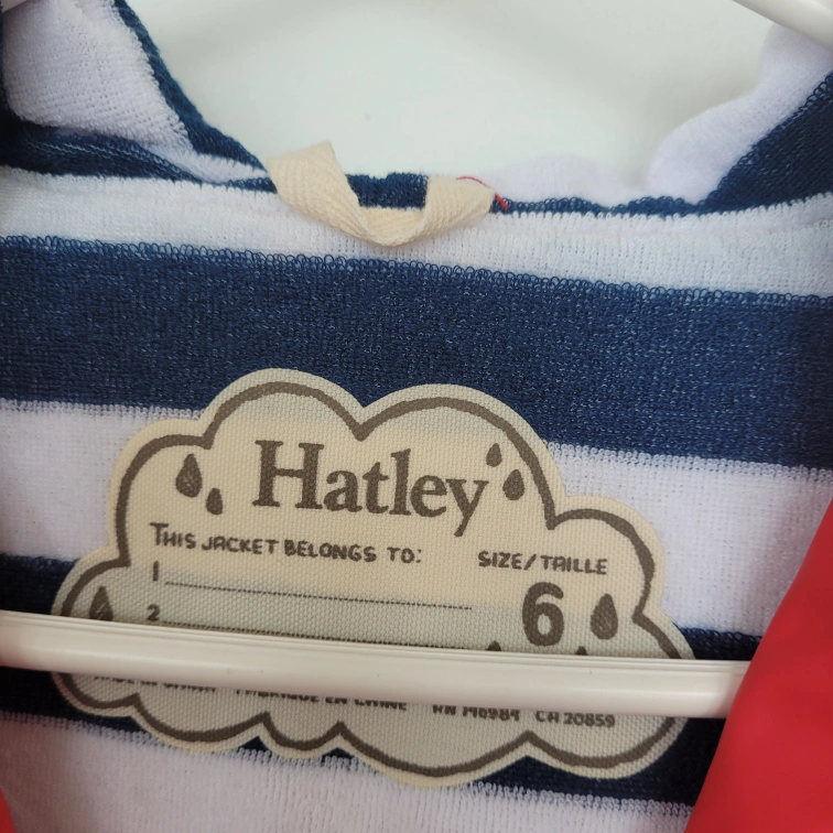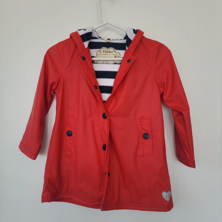 A cute red raincoat from Hatley, size 6! It has a striped lining inside the hood and body. Perfect for keeping your little one dry on rainy days. Brand new but no tags.