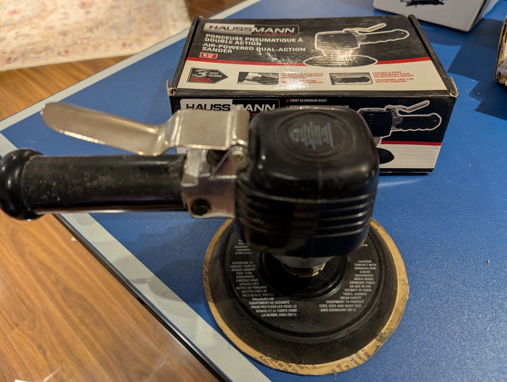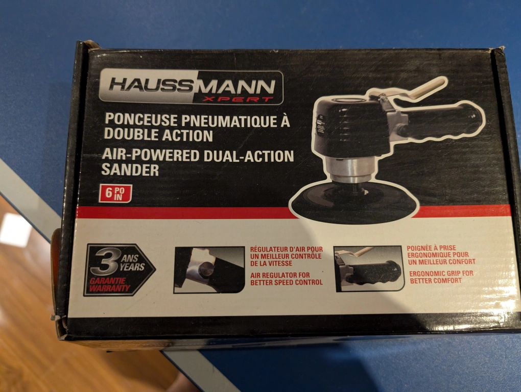 Selling a Haussmann Xpert air-powered dual-action sander. It comes with the original box. This sander features an air regulator for better speed control and an ergonomic grip for better comfort. Perfect for your sanding needs!