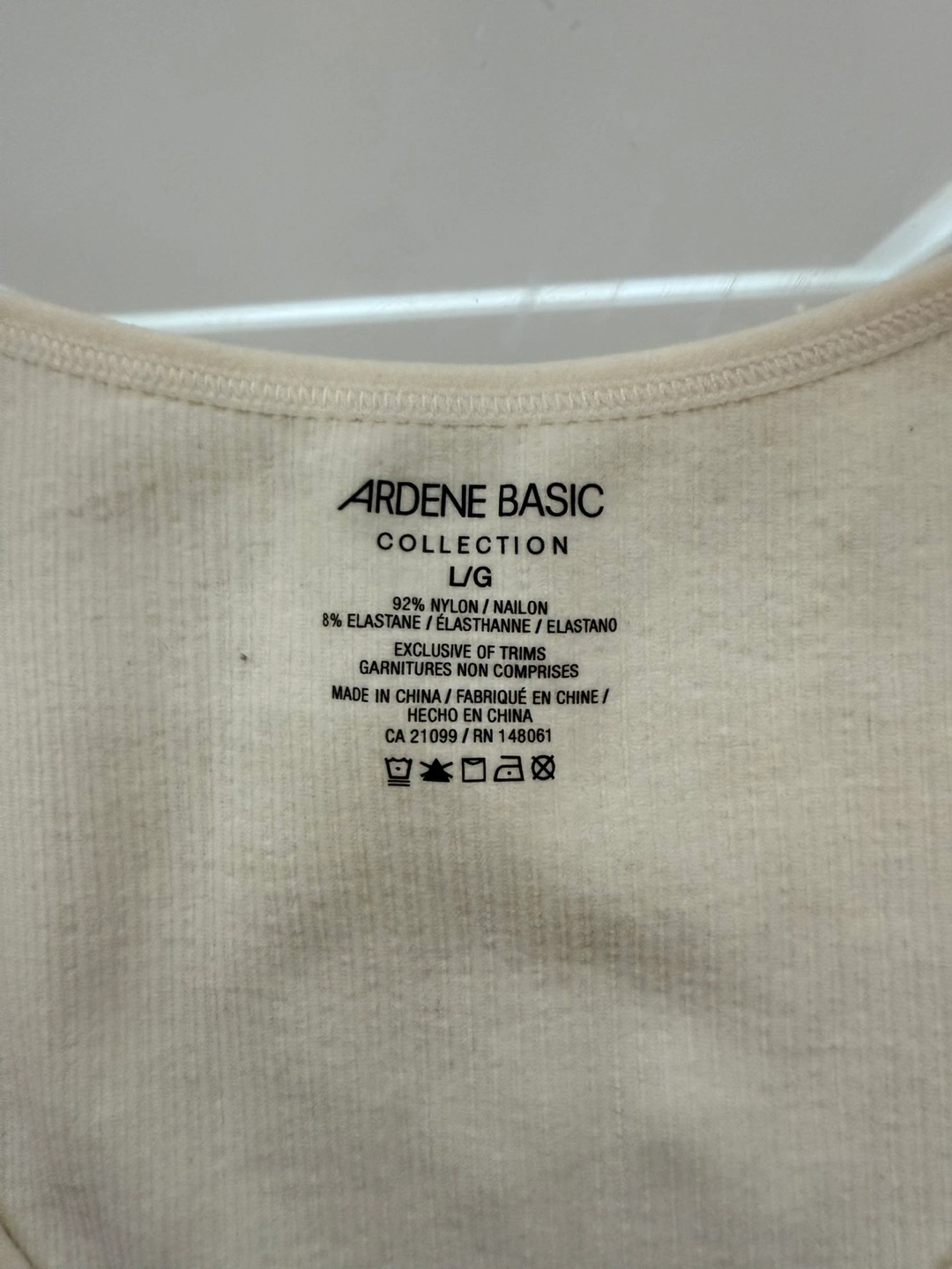 J'vends un haut basic de la marque Ardene, de taille L/G. Il est fait de 92% nylon et 8% élasthanne. Parfait pour un look décontracté!
