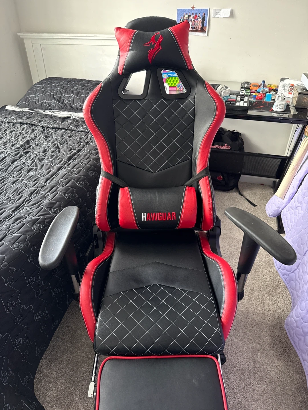 Selling a HAWGUAR gaming chair in black and red. It features a headrest and lumbar support for comfortable gaming sessions. The chair is in good condition and ready for a new home!