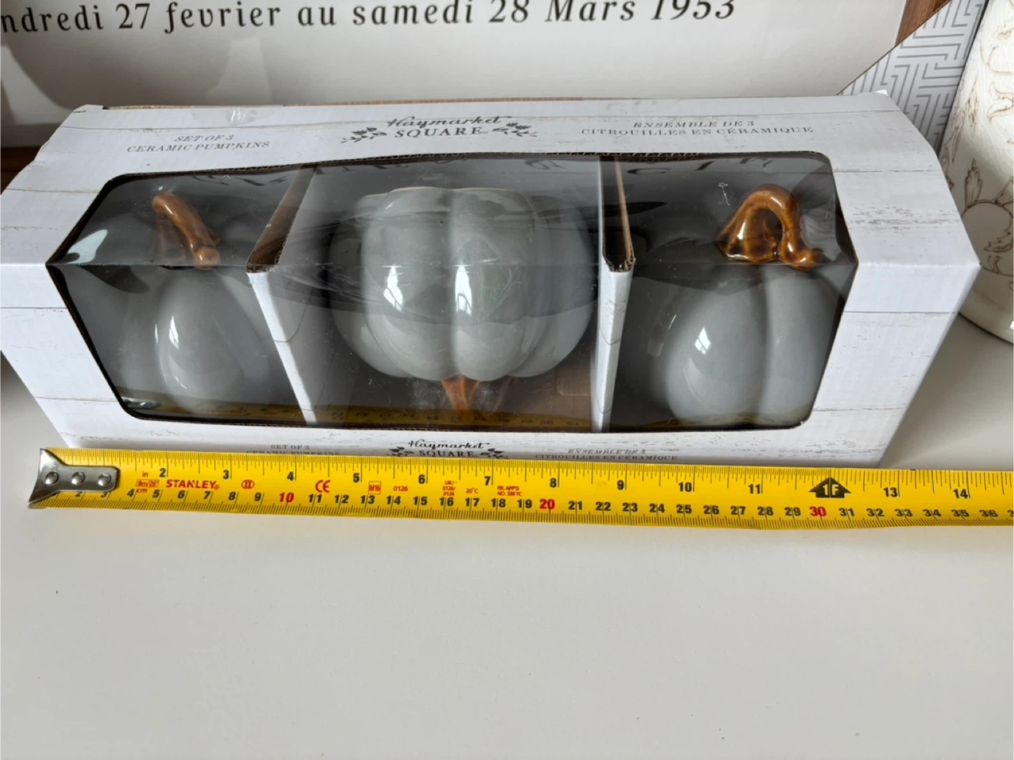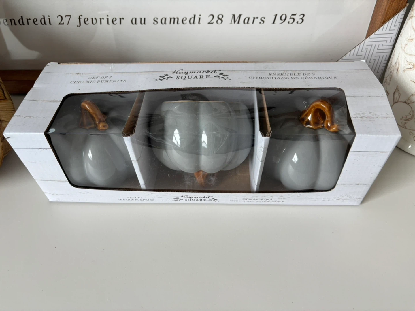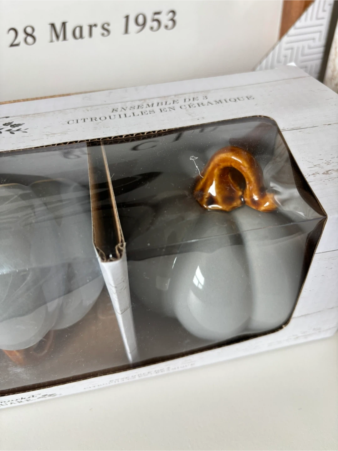 Selling a set of 3 ceramic pumpkins from Haymarket Square! They are still in their original packaging and ready to add a touch of autumn charm to your home. The pumpkins are a lovely grey colour with brown stems. Each pumpkin is approximately 4 inches wide.