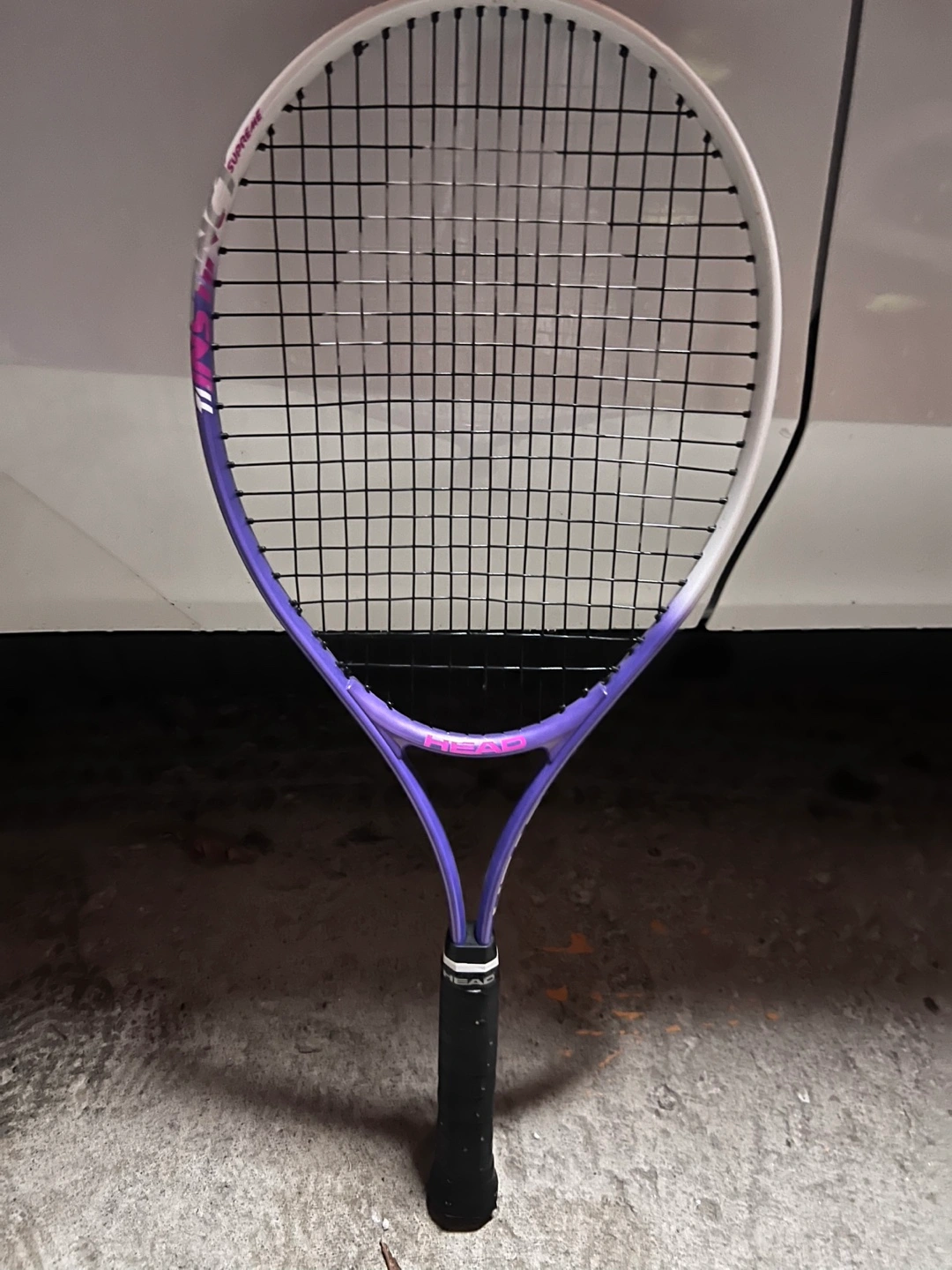 Used Head tennis racquet. Purple and white colour scheme. Good condition. Ready to play. Beginner level racquet.