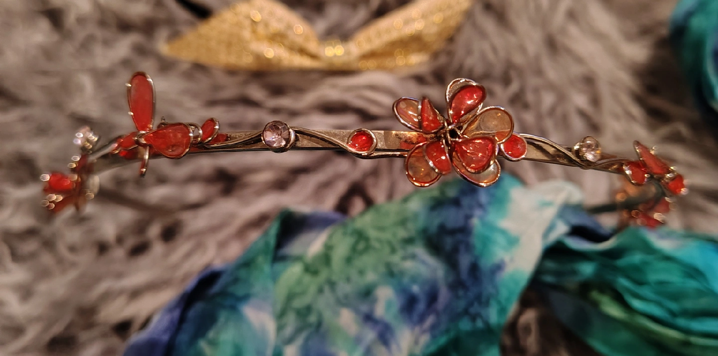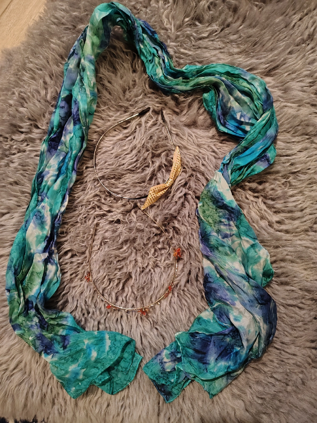 Selling a collection of headbands and a scarf! The scarf has a beautiful blue and green tie-dye pattern. There are also two headbands included: one gold, one with red flowers and butterflies