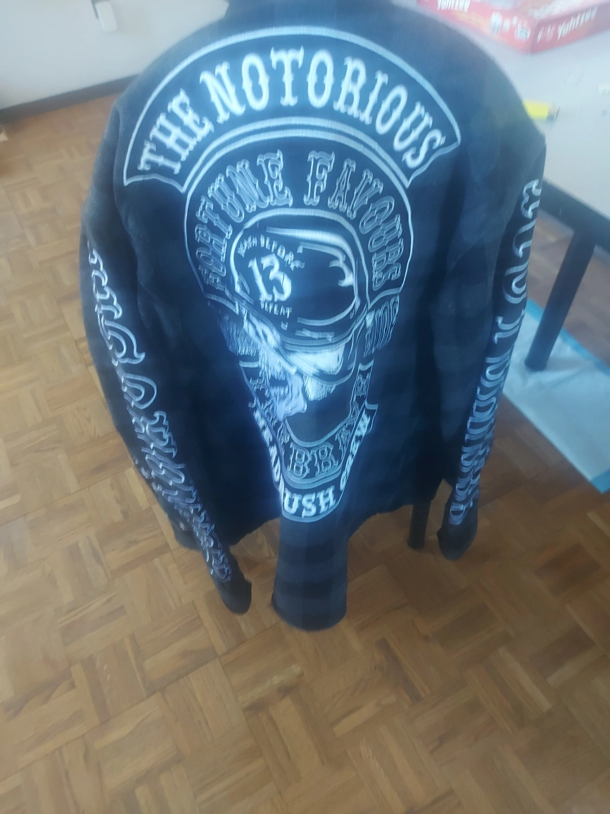 Selling a jacket with "THE NOTORIOUS FORTUNE FAVOURS" printed on the back. It also features a skull design and the number 13. The sleeves also have a unique design. Great for anyone who likes a bit of edge to their style