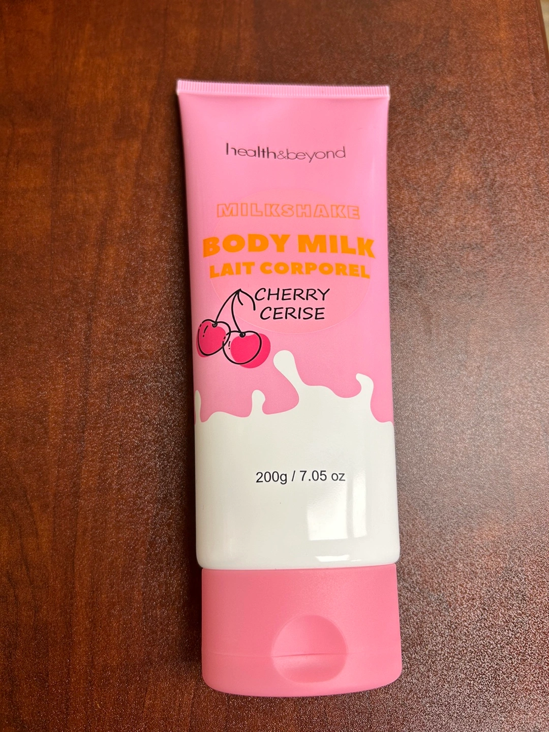 New, unopened tube of Health & Beyond Milkshake Body Milk in Cherry scent. 200g / 7.05 oz. Pink tube with a flip-top cap.