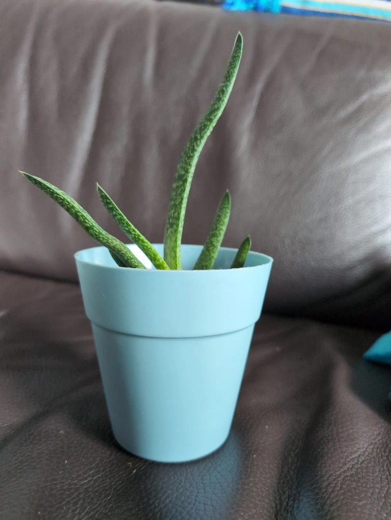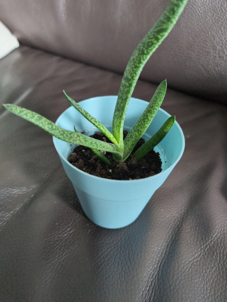 Gasteria succulent in a plastic light blue pot. Spotted green leaves are firm, healthy and sprouting. A charming addition for any room. You can enjoy watching the plant grow day by day, which can be very soothing.