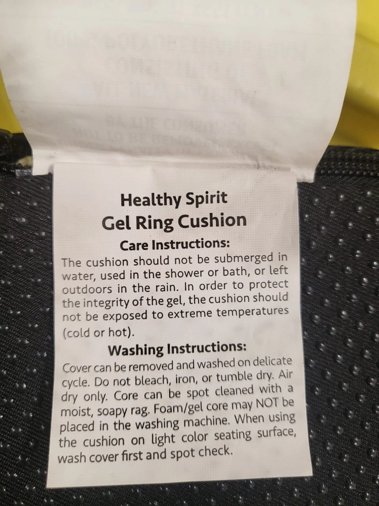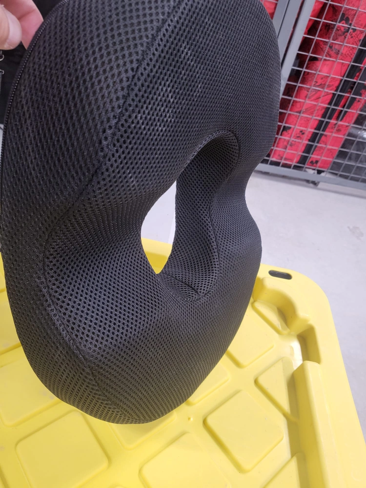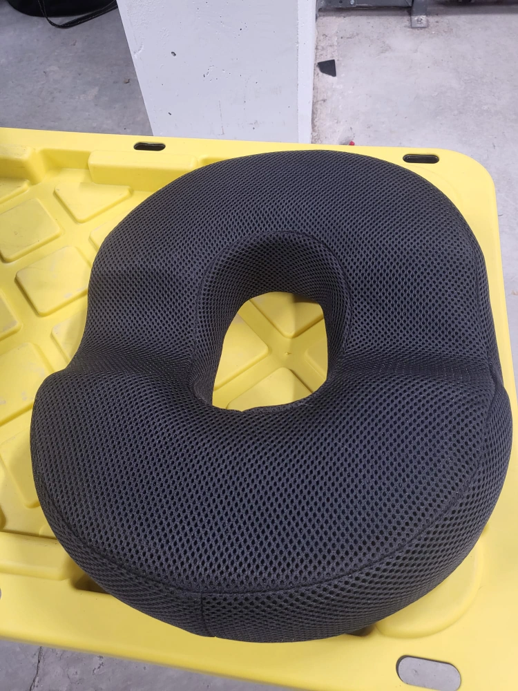 Gel Cushion featuring a ring shape. Mesh cover. Perfect for sitting comfortably during long workdays, or travelling by car, bus, or plane.