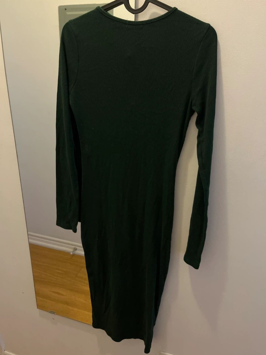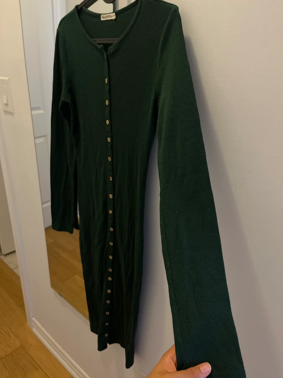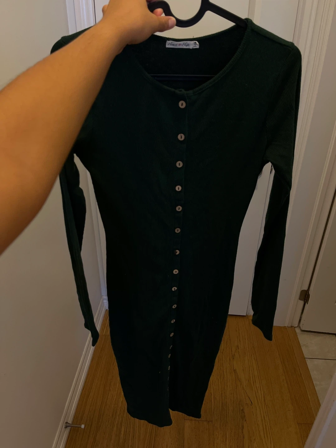 Selling a cute green ribbed dress from Heart & hips! It's a long-sleeved, button-up style, perfect for a casual or dressed-up look. The material is soft and comfortable, making it a great addition to your wardrobe