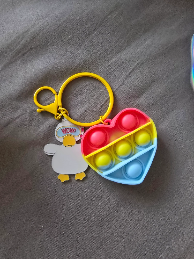 This is a cute heart-shaped Pop It keychain with a fun duck charm! The Pop It is in red, yellow, and blue, and the keychain itself is yellow. It's perfect for adding a bit of fun to your keys or backpack