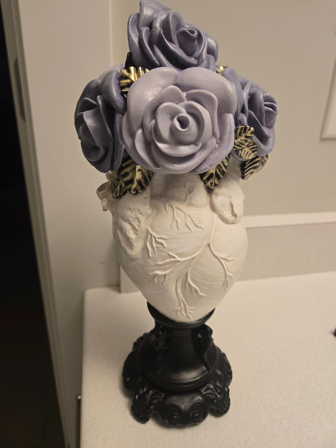 Unique heart-shaped sculpture with lavender roses. The base is black and ornately designed, and the 'heart' part is white with a textured surface. A lovely piece for adding a touch of gothic romance to your space!
