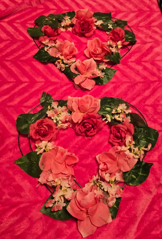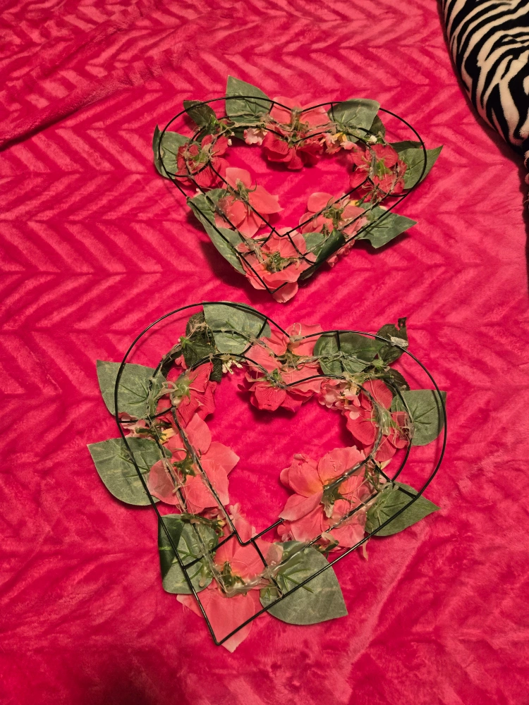 Selling a set of two heart-shaped floral wreaths! These are perfect for adding a touch of charm to any room or event. They feature lovely pink and red flowers with green leaves, all arranged on a black wire frame. They're in great condition and ready to brighten up your space .. made by me..pick up SE flats $5 for both