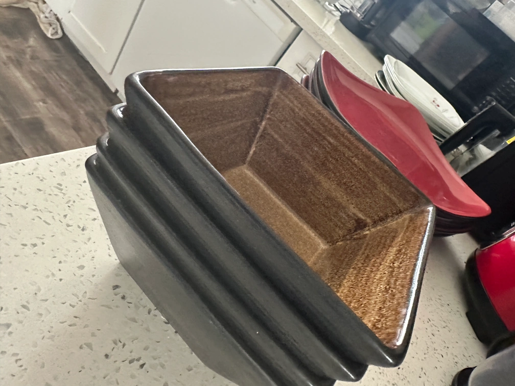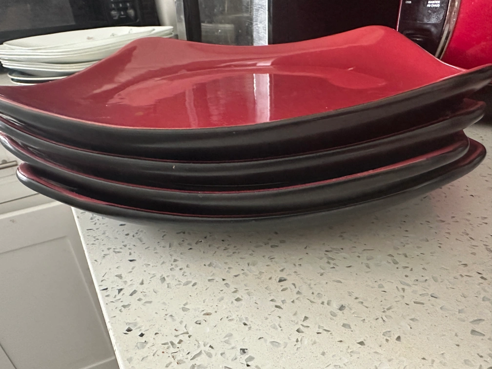 Selling a set of 4 Hearthstone stoneware plates! and 4 Bowls. They feature a sleek design with a combination of red and black colours. Perfect for adding a touch of modern style to your dining table