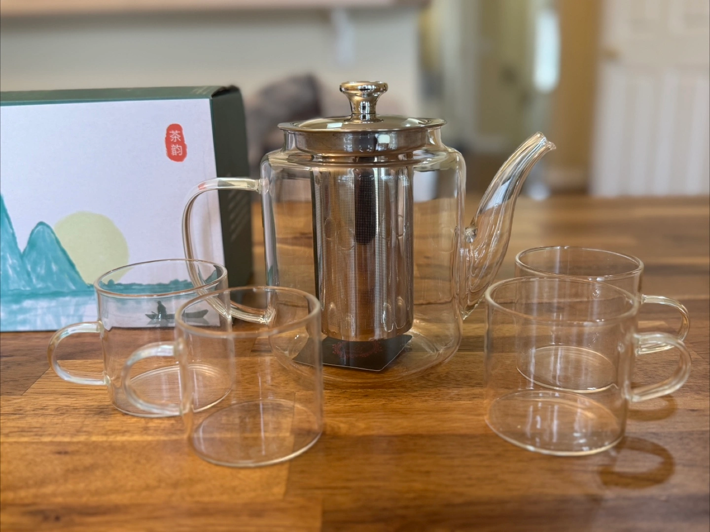New unused. 800 ml Heat Resistant Glass teapot set that includes four matching cups!