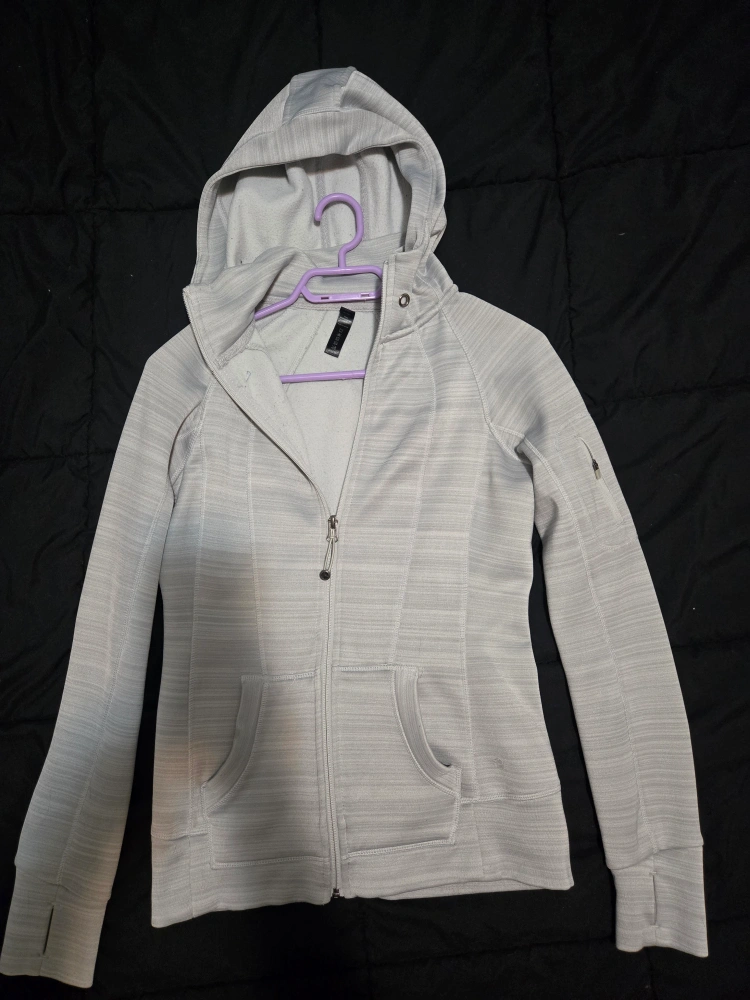 Selling zip-up hoodie in a lovely heathered grey colour! It's in great condition and perfect for layering on those cooler days. Features a comfortable hood and convenient pockets. A stylish and practical addition to your wardrobe!