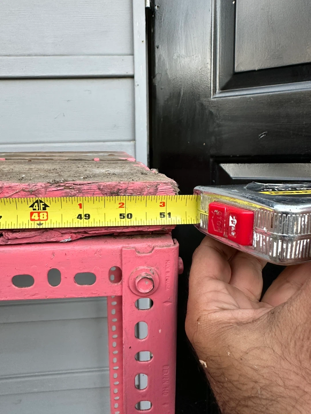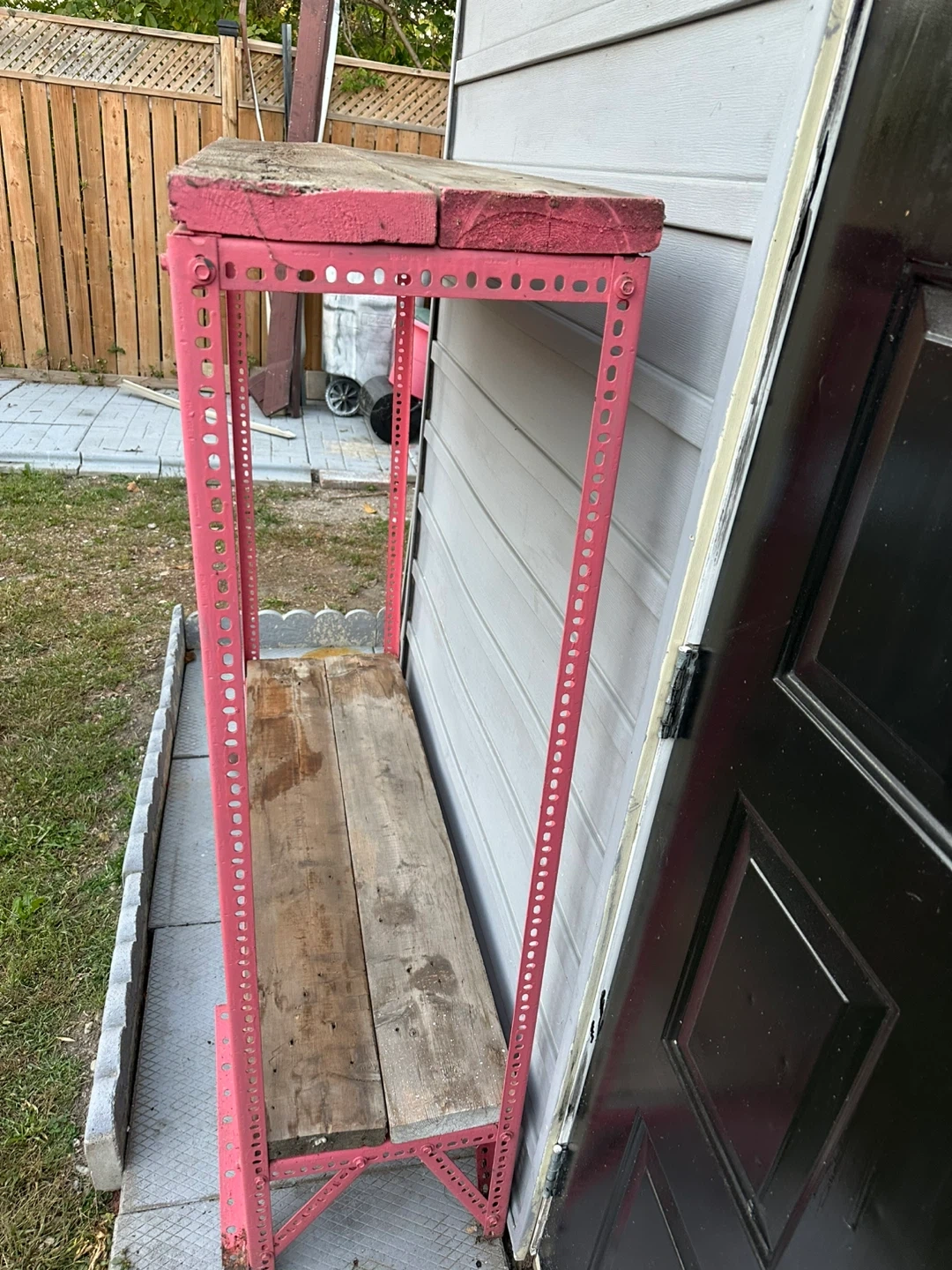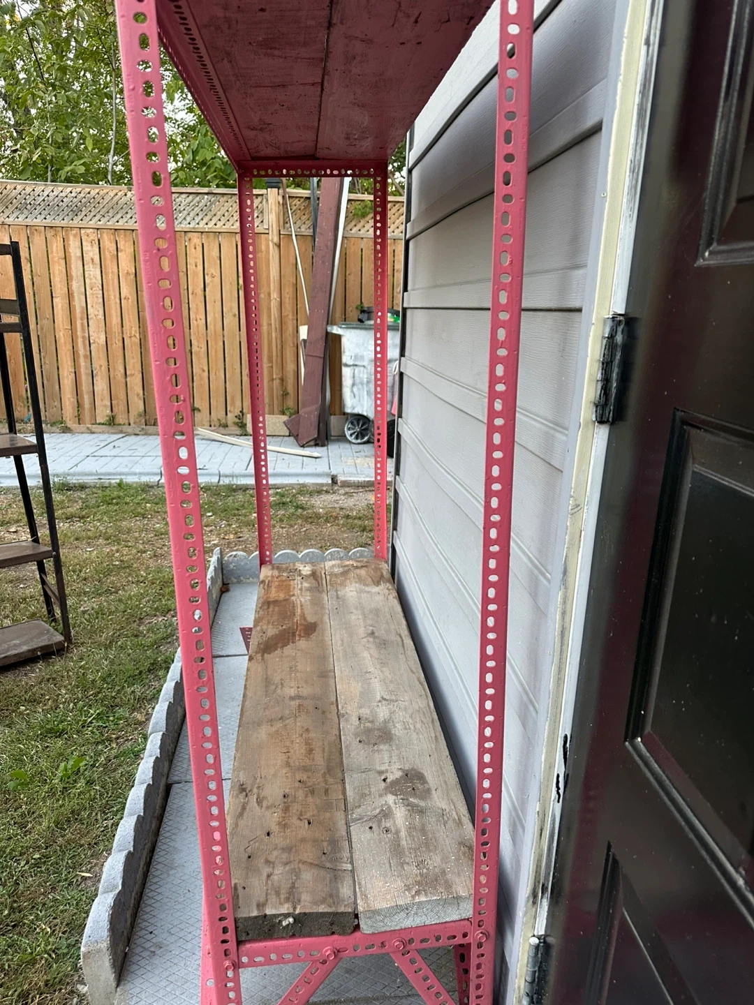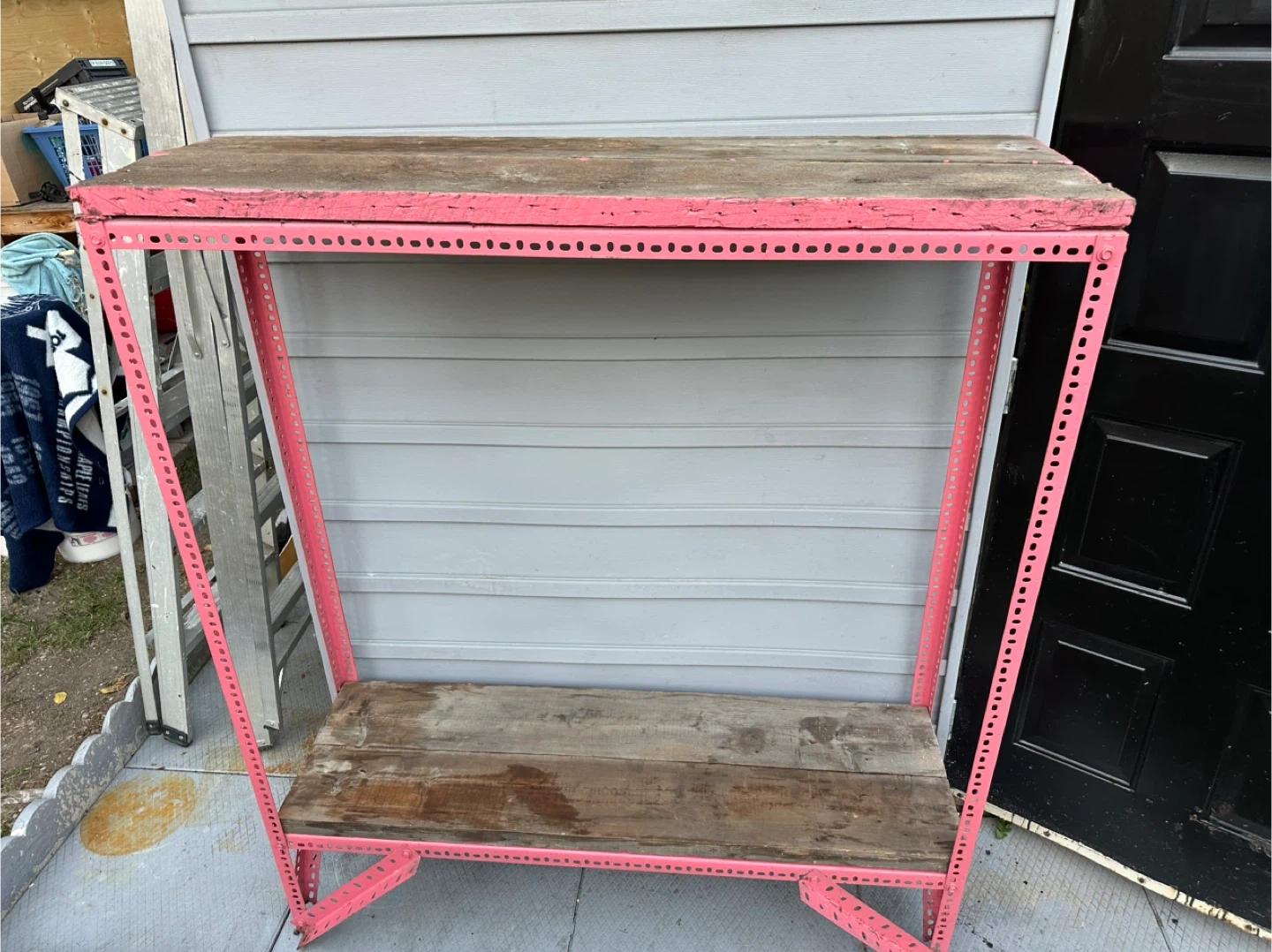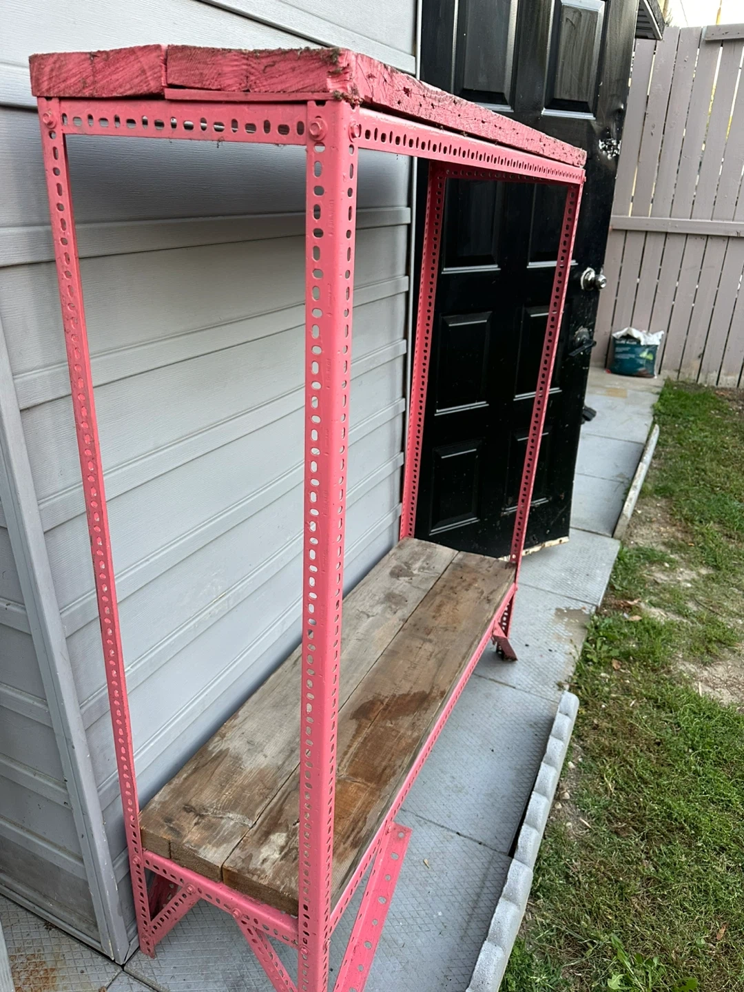 H-58 inch L- 51 inch W - 16 inch frame with wooden shelves. Perfect for adding a touch of rustic charm to any space. It's sturdy and ready for a new home!