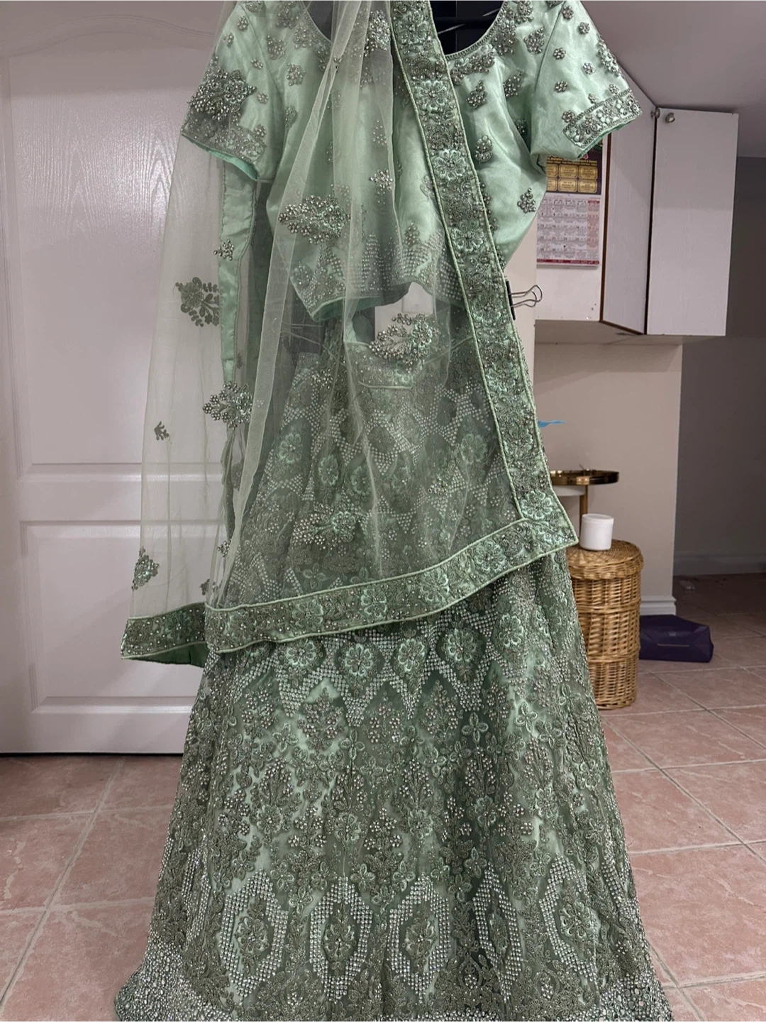 Beautiful green stonework bridal lehenga set with intricate embroidery. Perfect for a special occasion!! Skirt has can can skirt stitched in. Lots of room in blouse to take in or extend $350 OBO Pickup in Brampton