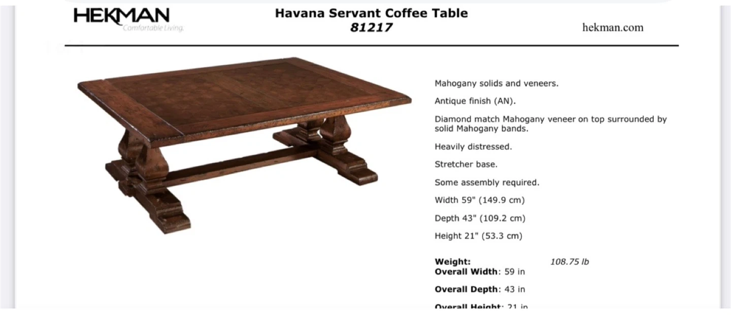 Selling a Hekman Havana Servant Coffee Table. It's made of mahogany solids and veneers with an antique finish. The top has a diamond match mahogany veneer surrounded by solid mahogany bands. The table is heavily distressed and features a stretcher base. Dimensions are approximately 59" wide, 43" deep, and 21" high