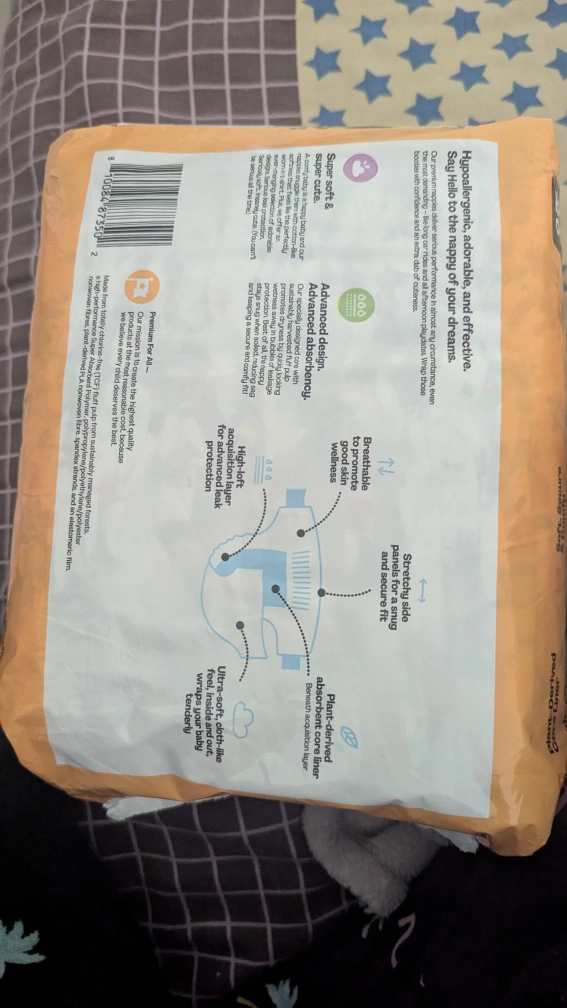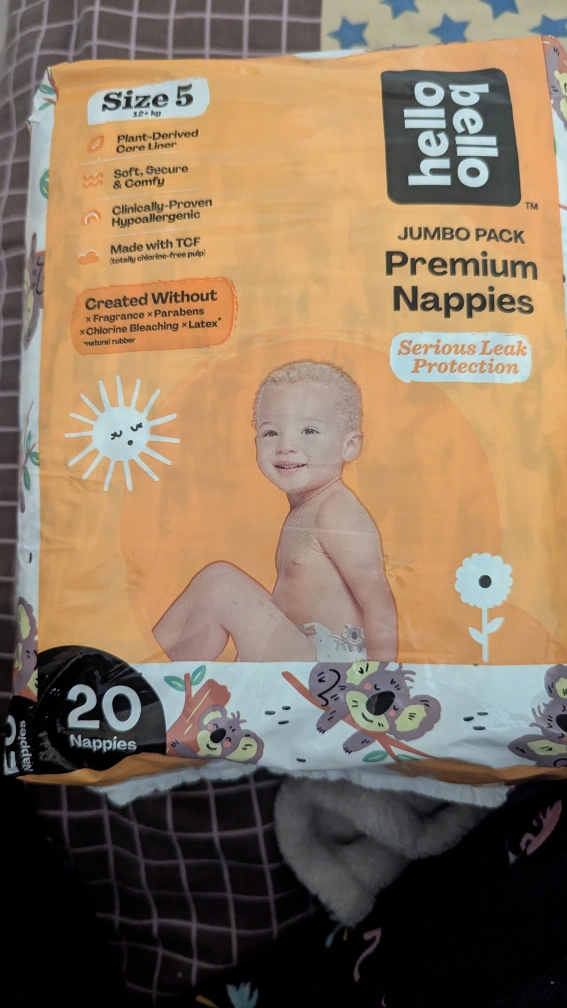 Hello Bello Jumbo Pack Premium Nappies in Size 5 (12+ kg). These nappies offer serious leak protection and are made with a plant-derived core liner. They are soft, secure, and comfy, plus clinically-proven hypoallergenic. Created without fragrances, parabens, chlorine bleaching, and latex