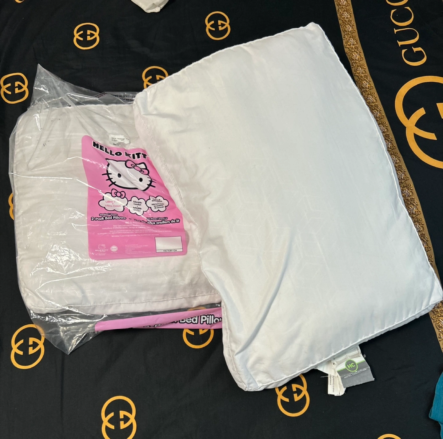 Selling a set of Hello Kitty pillows! The set includes two soft and comfy pillows, perfect for adding a touch of cuteness to any bedroom. One pillow is still in its original packaging, while the other is loose. Great for Hello Kitty fans!
