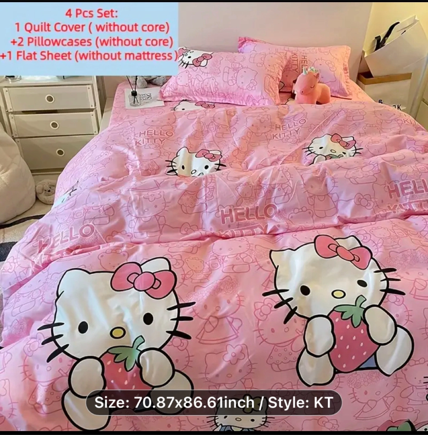 New packed piece This adorable Hello Kitty bedding set includes: - 1 Quilt Cover (without core) - 2 Pillowcases (without core) - 1 Flat Sheet (without mattress) Size: 70.87x86.61inch Theme set for kids