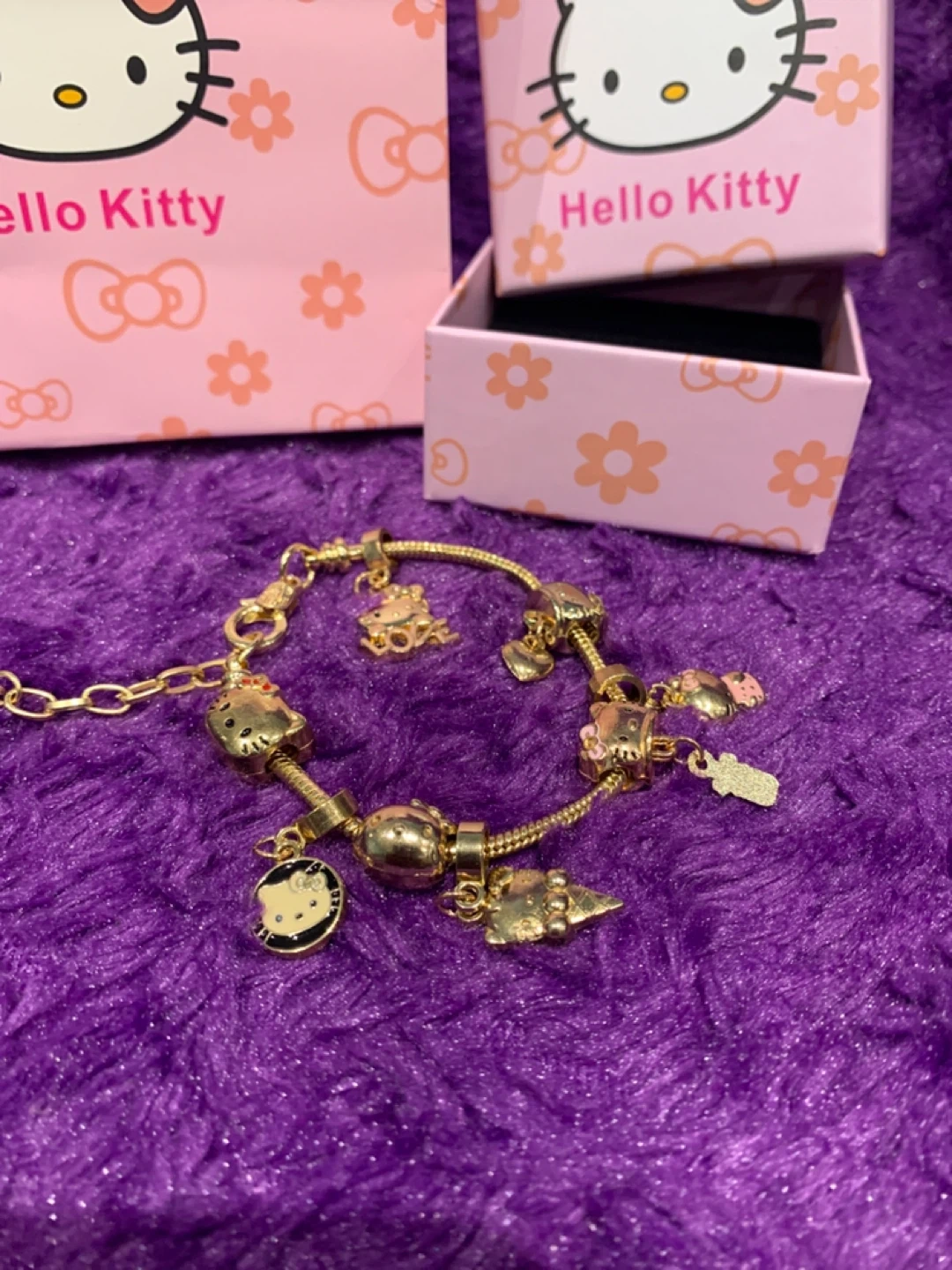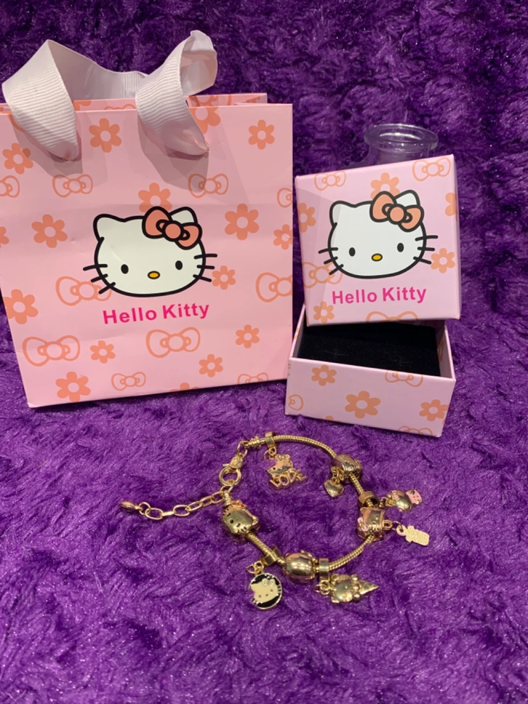 This is an adorable Hello Kitty charm bracelet! It comes with the original box and gift bag. The bracelet is gold-toned and features various Hello Kitty charms. Perfect for any Hello Kitty fan!