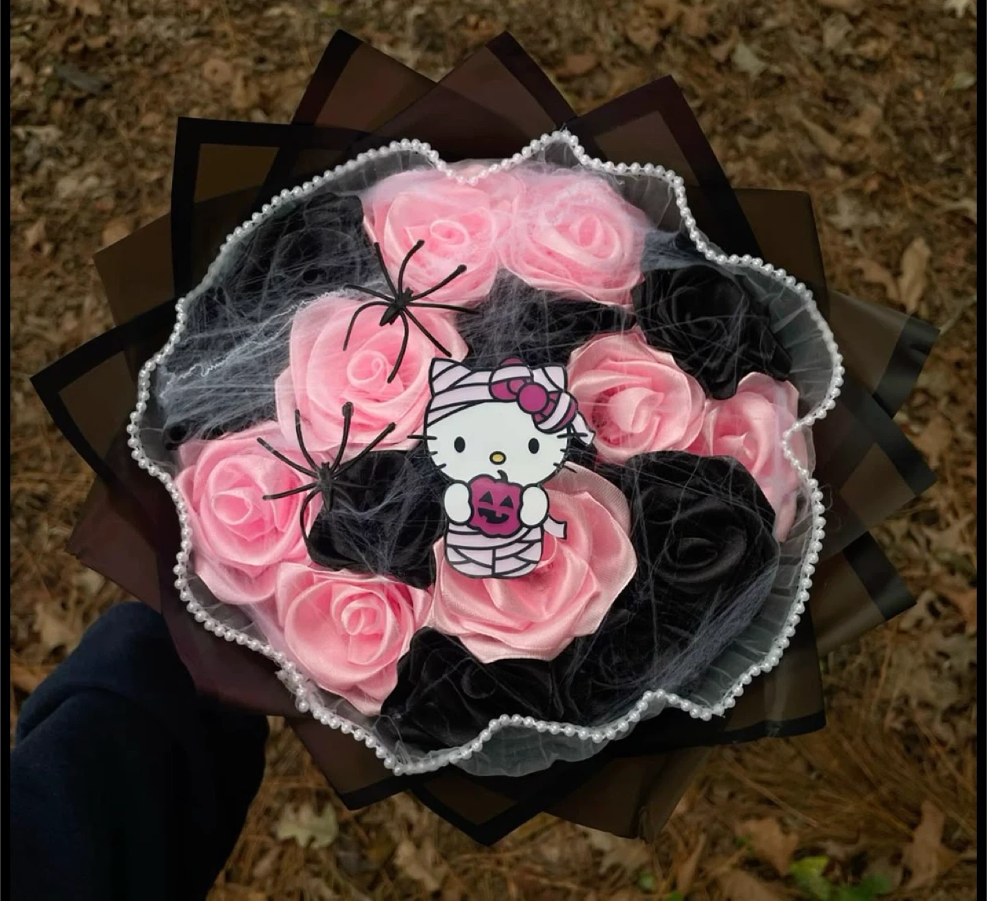 β₯Selling a super cute Hello Kitty Halloween bouquet! It features pink and black roses, spider web detailing, and little spider accents. Perfect for a Halloween gift or decoration! β₯πβ³ π»β΄π πβ΄πβ― πΎππ»β΄