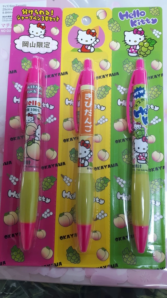 Here's a brand new Hello Kitty mechanical pencil set! This set includes three adorable pencils, each with a different fruit theme: peach, grape, and a mix of both. Perfect for any Hello Kitty fan or collector!