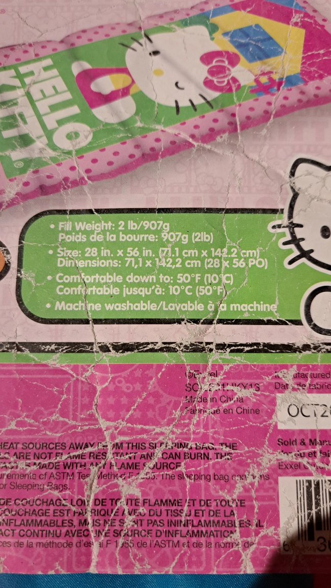 Keep your little one cozy with this adorable Hello Kitty sleeping bag! It's perfect for sleepovers or camping trips. Dimensions: 28 in x 56 in (71.1 cm x 142.2 cm) Comfortable down to 50°F (10°C) Machine washable