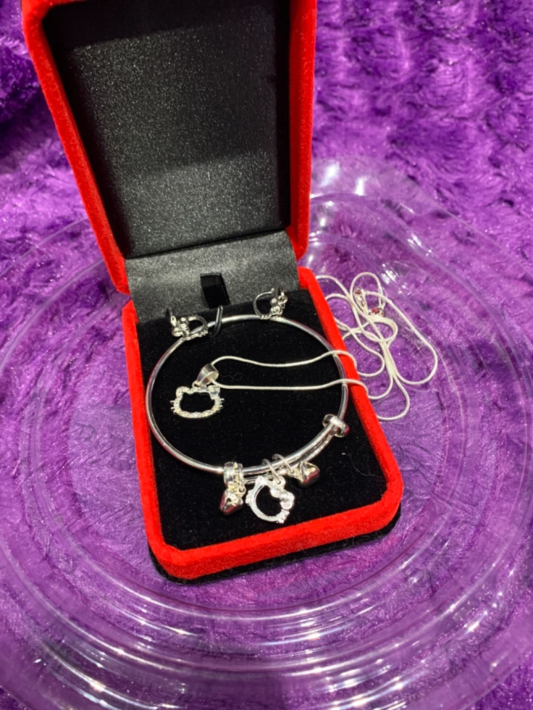 Selling a cute Hello Kitty jewel set! It includes a 925 Chain, pendant bracelet silver plated , and a pair of stainless steel earrings. Perfect for any Hello Kitty fan! RED Box Inclueded