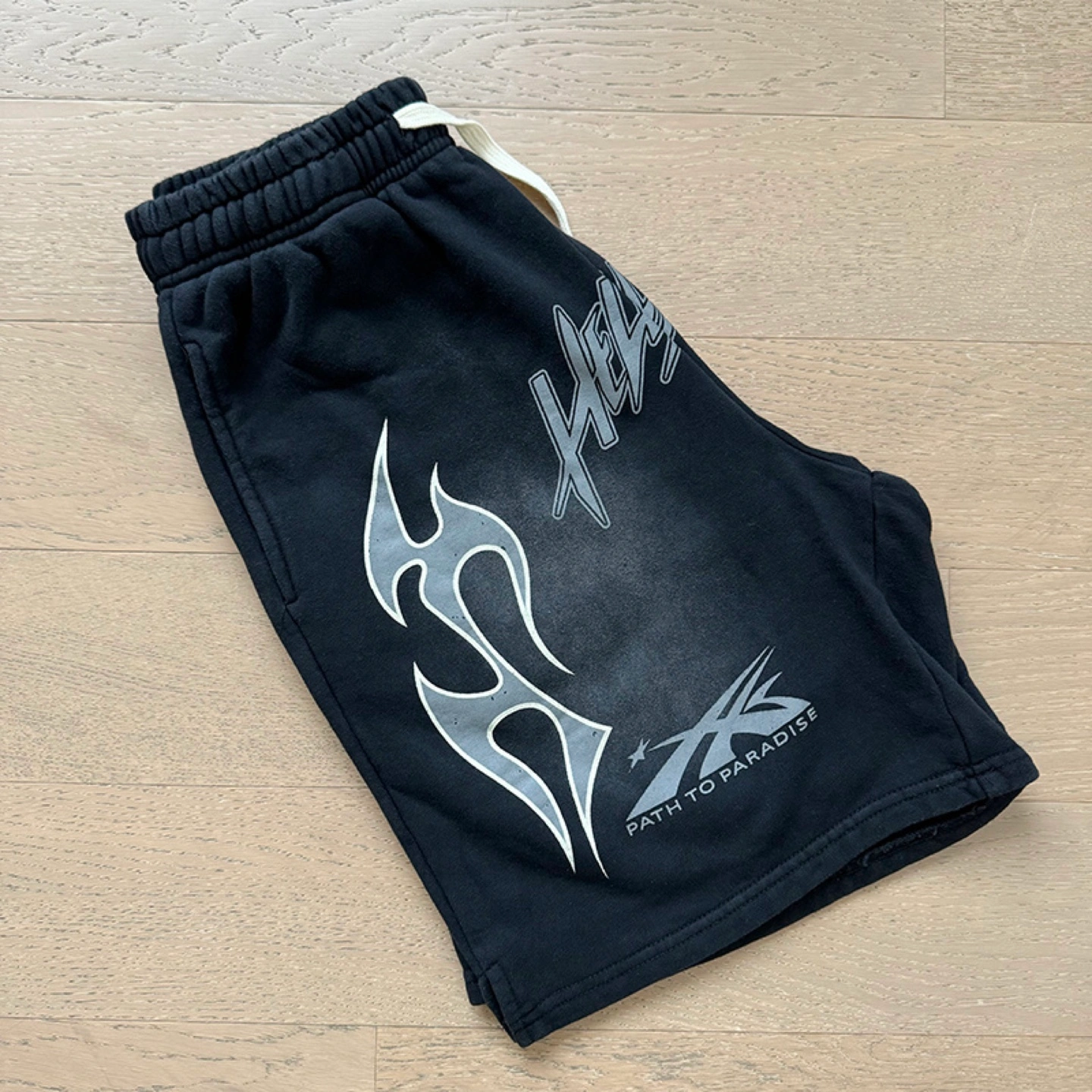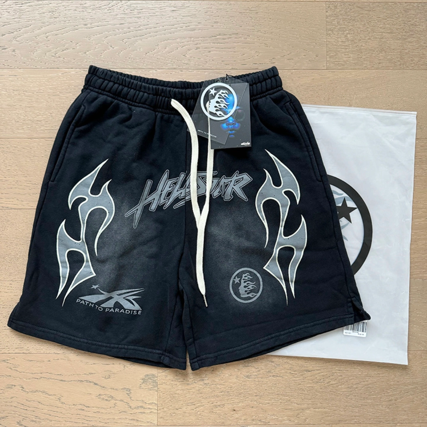 Selling a pair of Hellstar black shorts. They feature a unique design with 'HELLSTAR' and 'PATH TO PARADISE' graphics. The shorts are in excellent condition and ready for a new home! Comes with bags and tags
