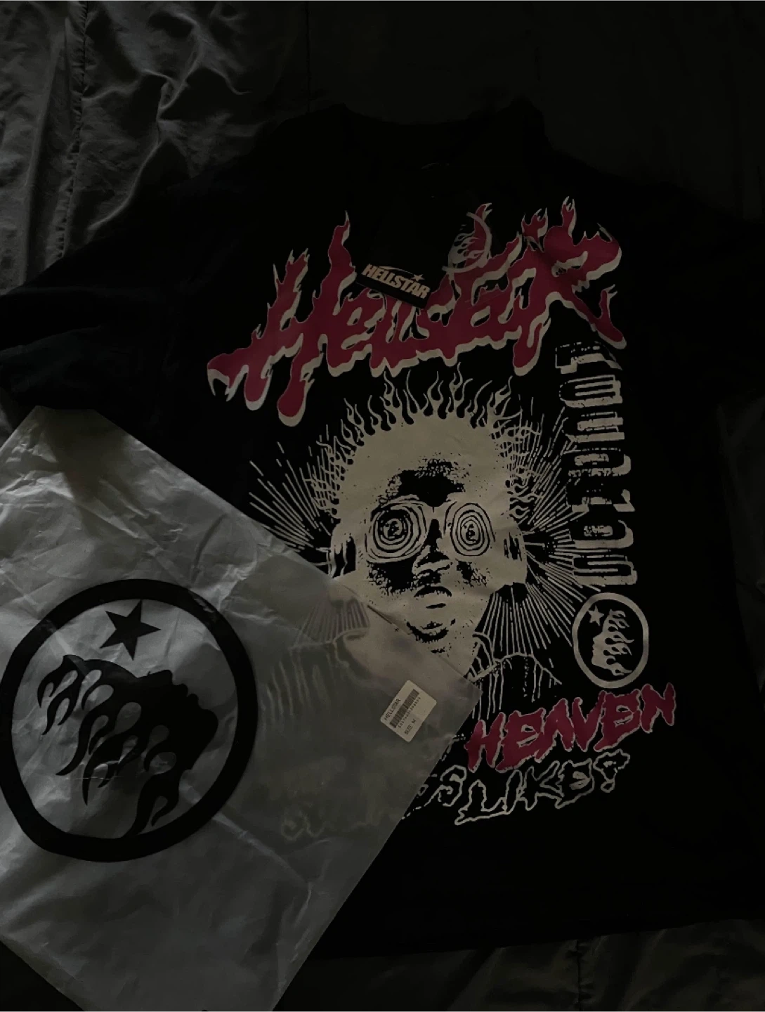 Pick-up in Secord Woods 📍 Selling a Hellstar Heaven Likes graphic t-shirt in black. Features a striking graphic design. Perfect for adding a unique piece to your wardrobe!