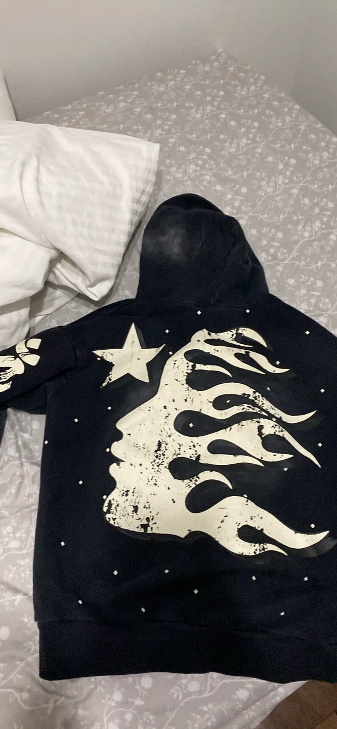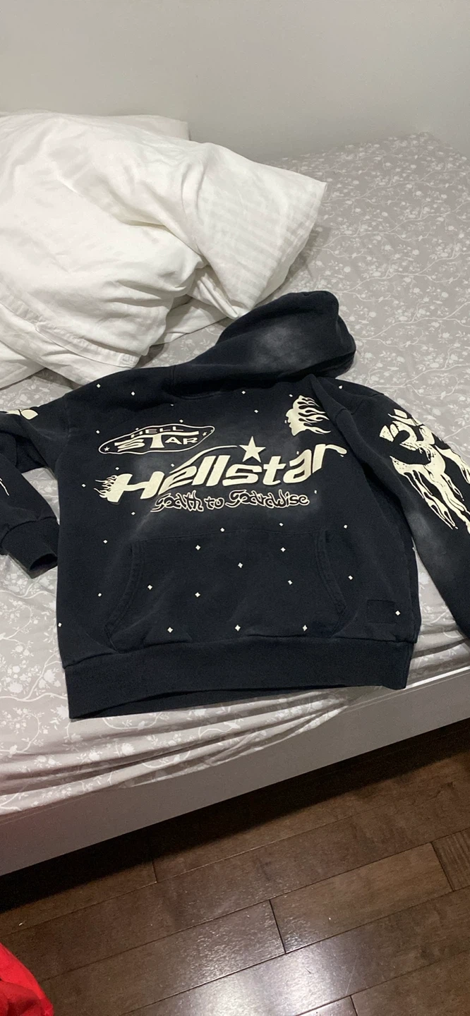 Selling a Hellstar hoodie. It's black with a unique graphic design featuring stars and flames. It has a hood and a front pocket. It appears to be in good condition with some signs of wear. dm for price or make deal