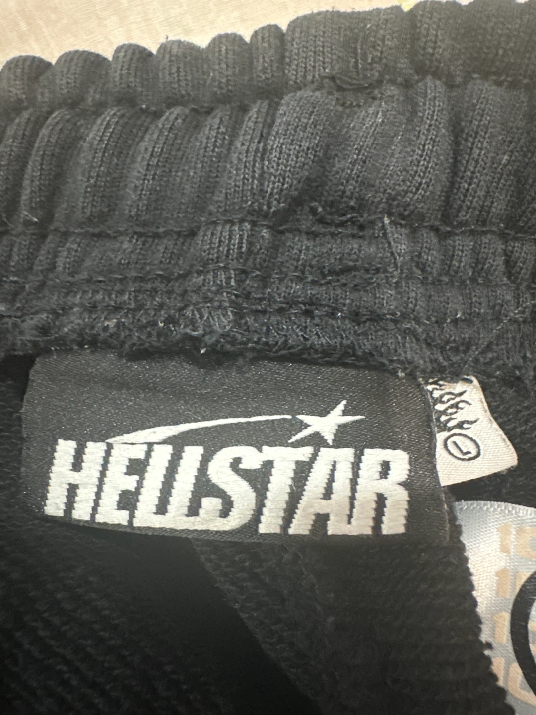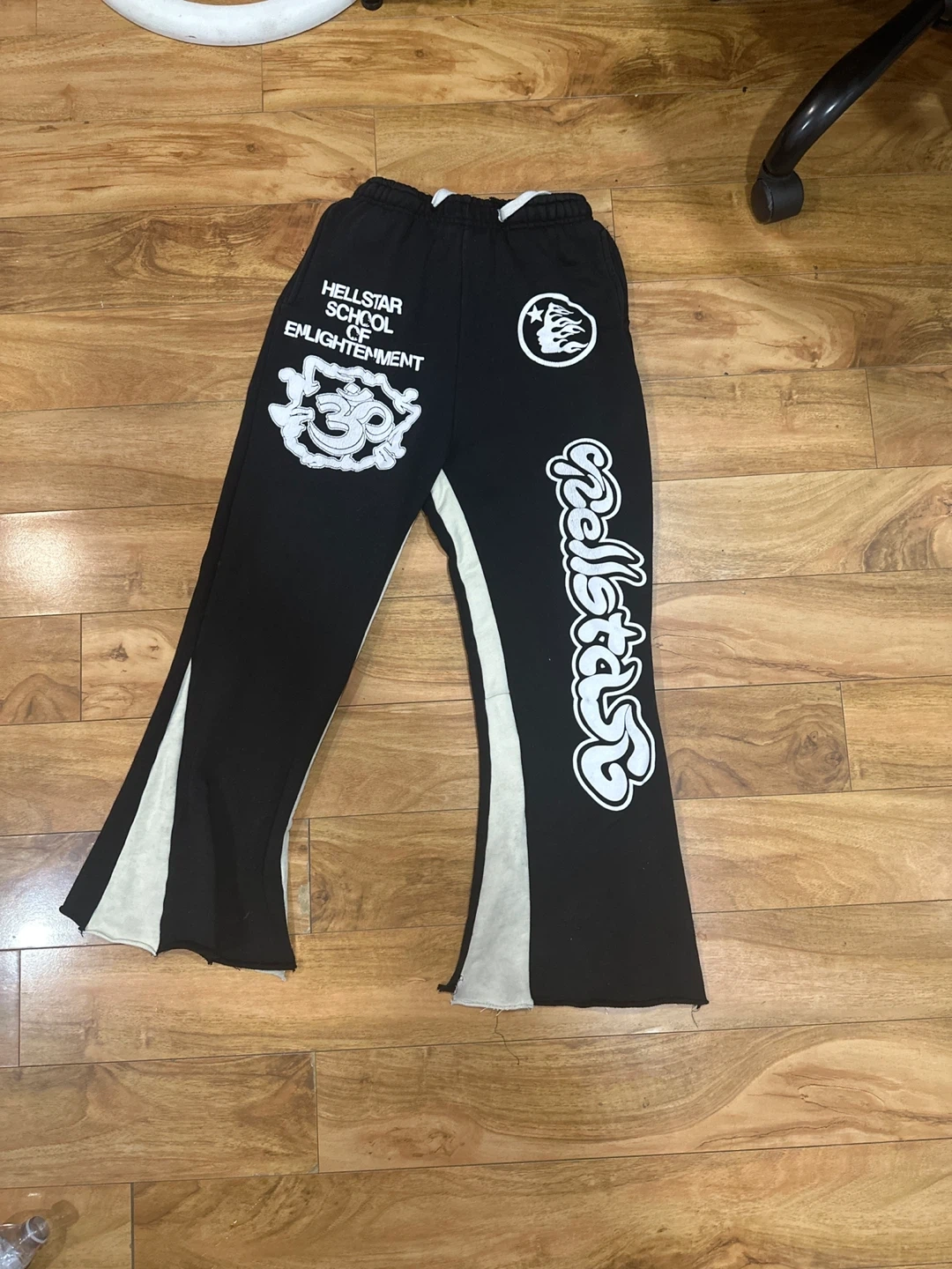 Selling a pair of Hellstar School of Enlightenment sweatpants in size Large! These black sweatpants feature a unique design with white accents and the Hellstar logo. They're in great condition and ready for a new home