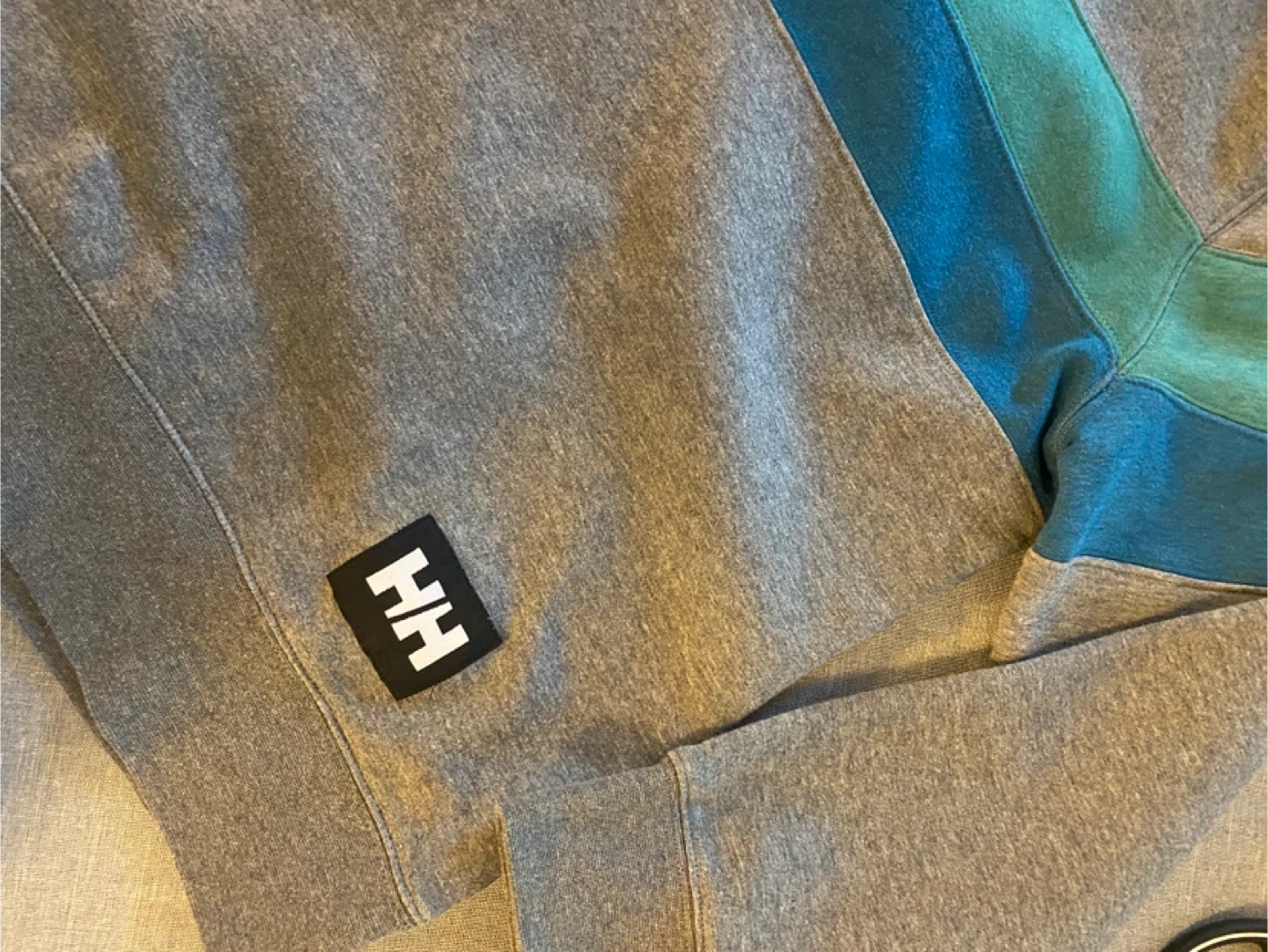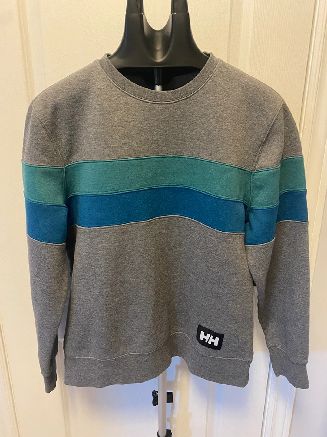 Cozy Helly Hansen crewneck sweater in size medium. It's a grey colour with green and blue stripes. Perfect for layering or wearing on its own!