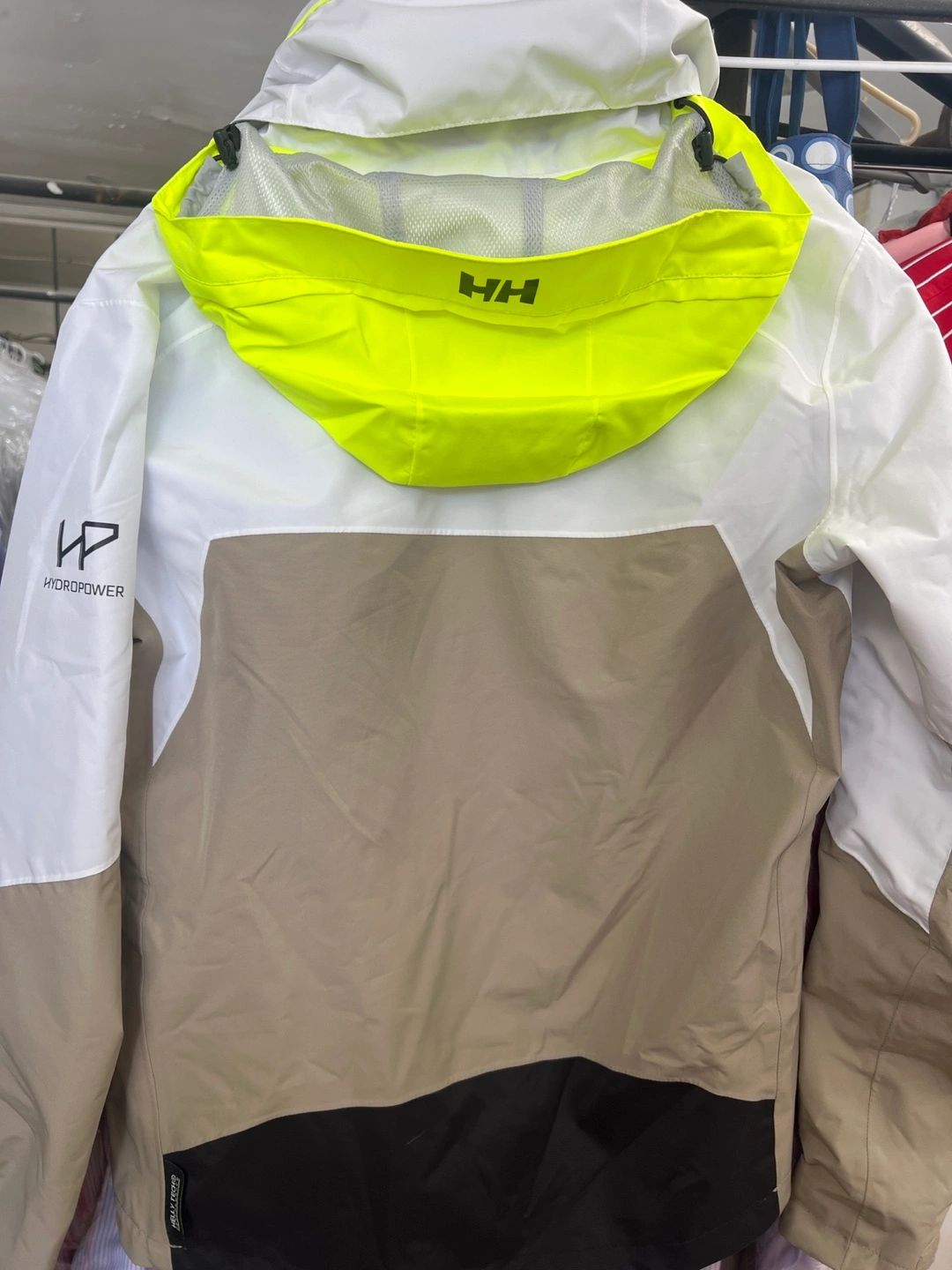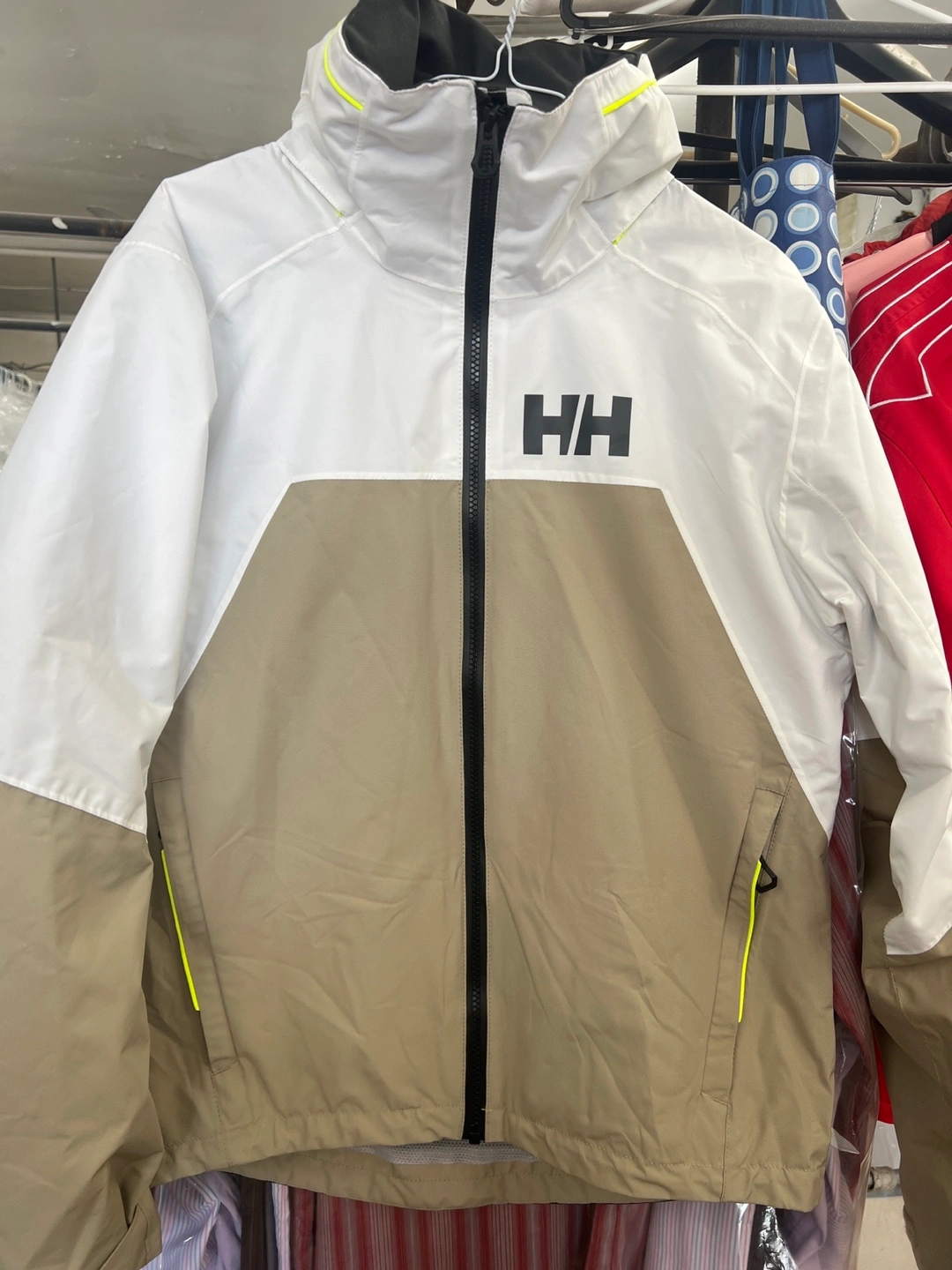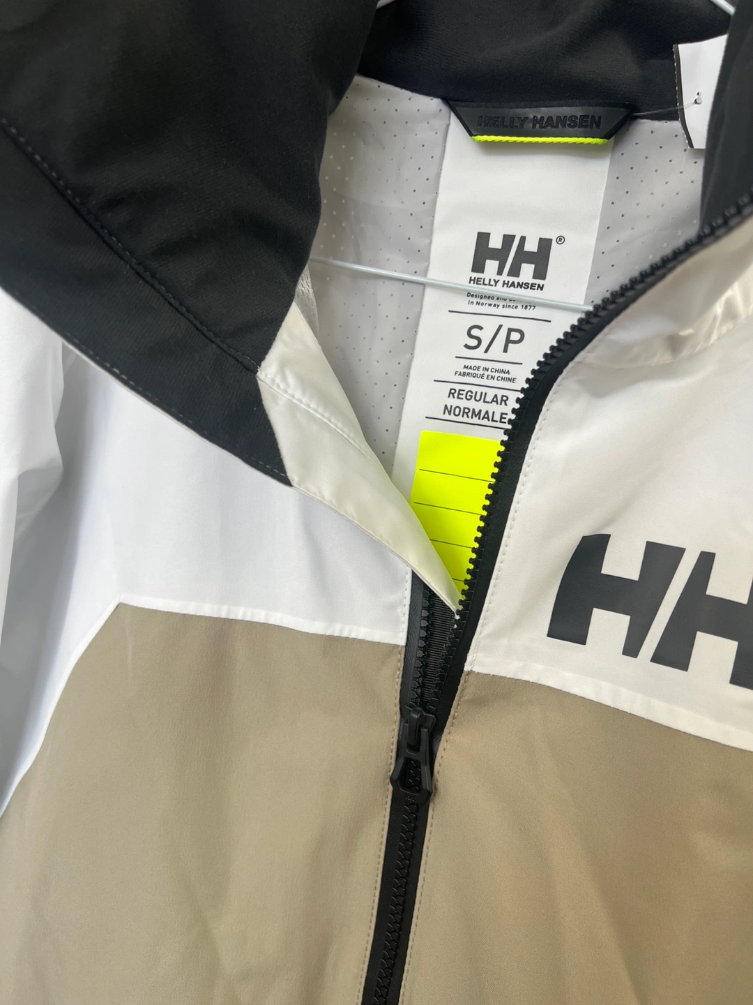 Colour-blocked jacket. Features a hood and zipper closure. Size small. Made in China.