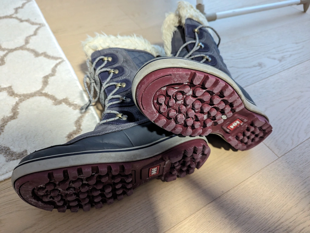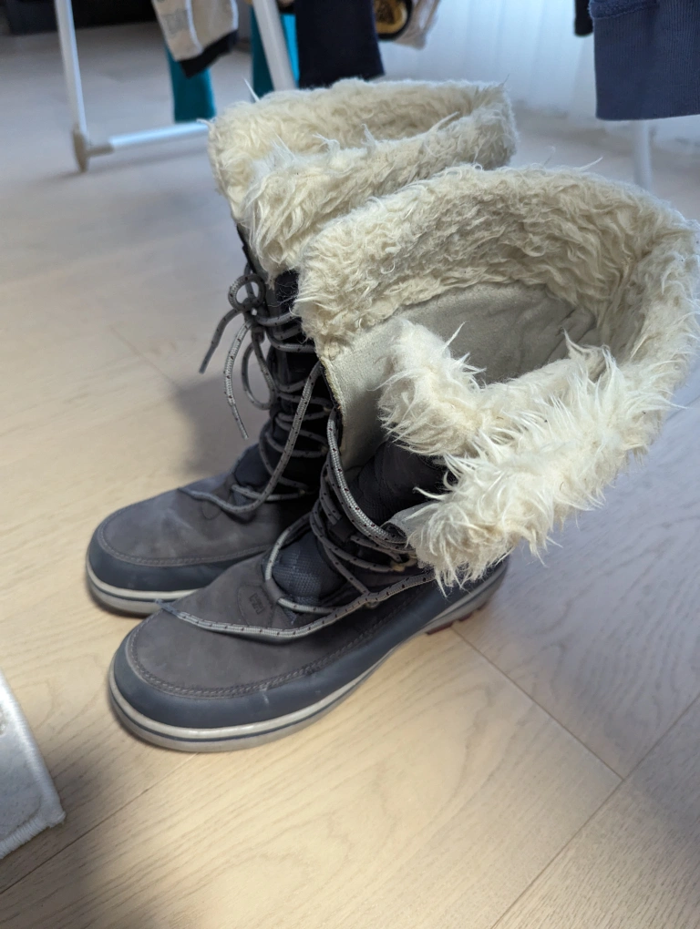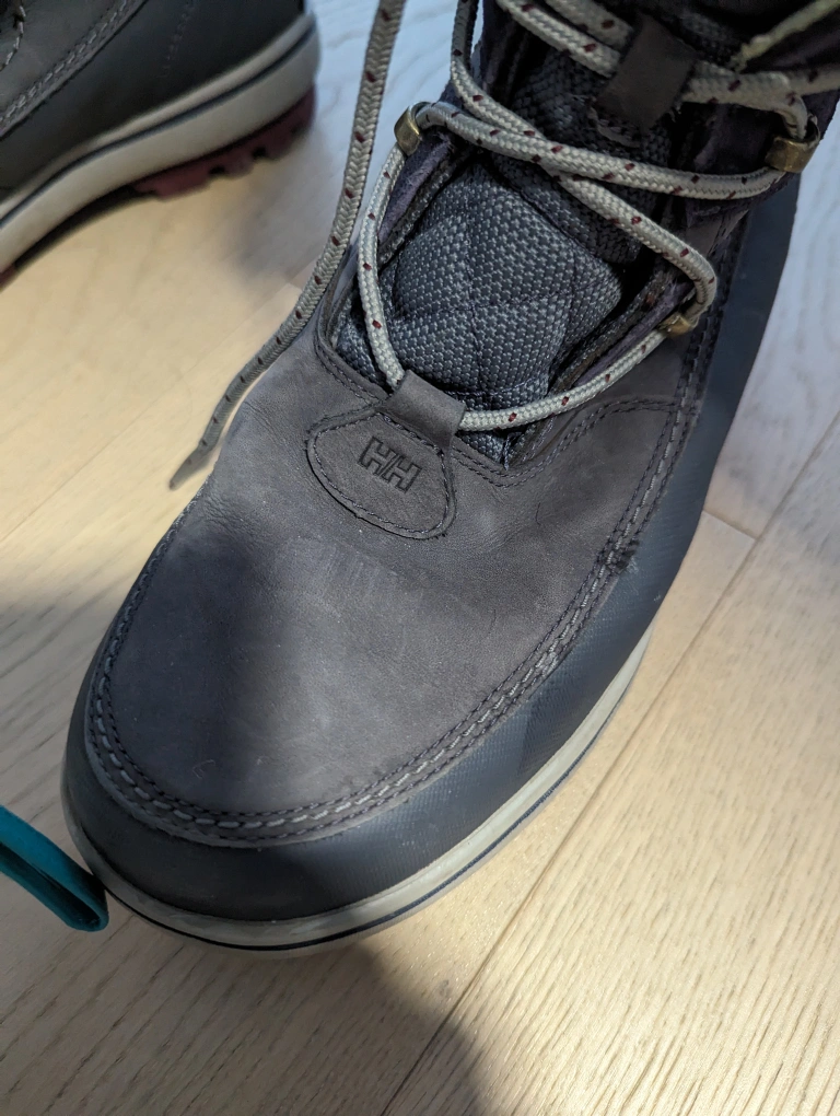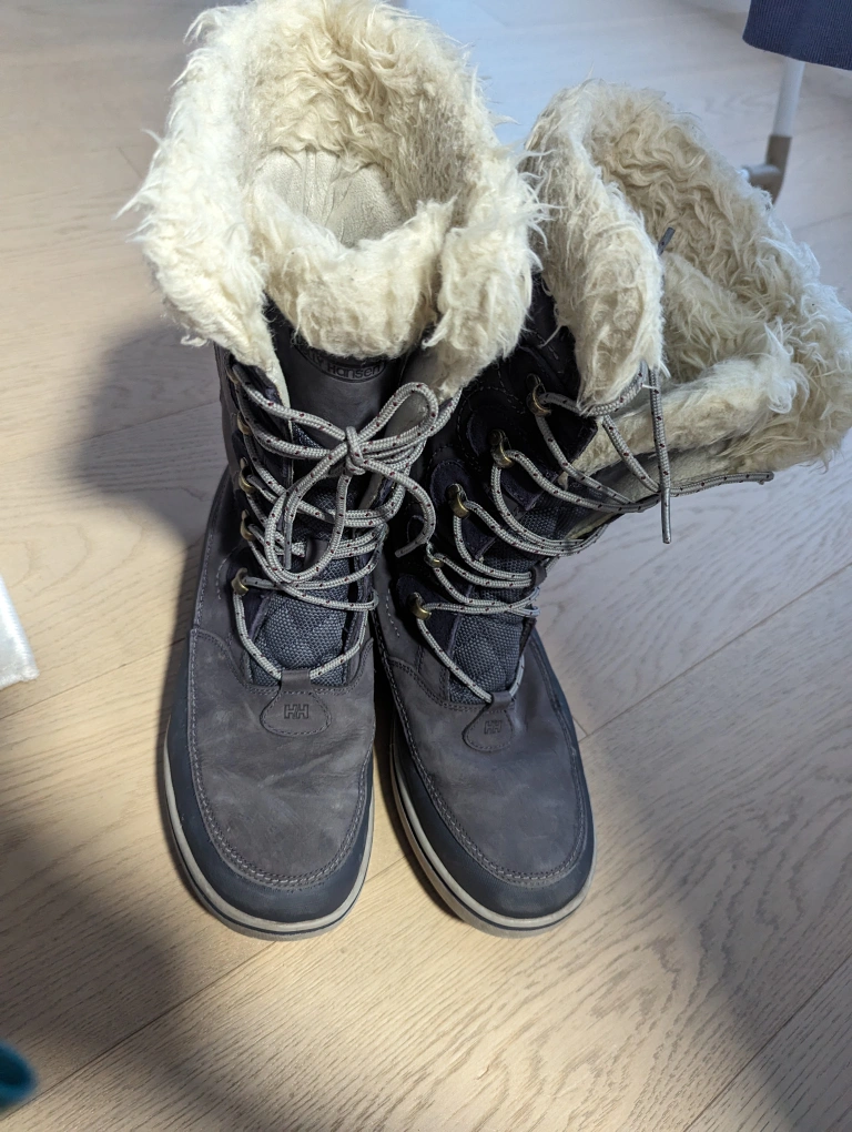 Women's Helly Hansen winter boots. Grey leather and textile upper. Warm faux fur lining. Lace-up closure. Good traction soles. Size 9.