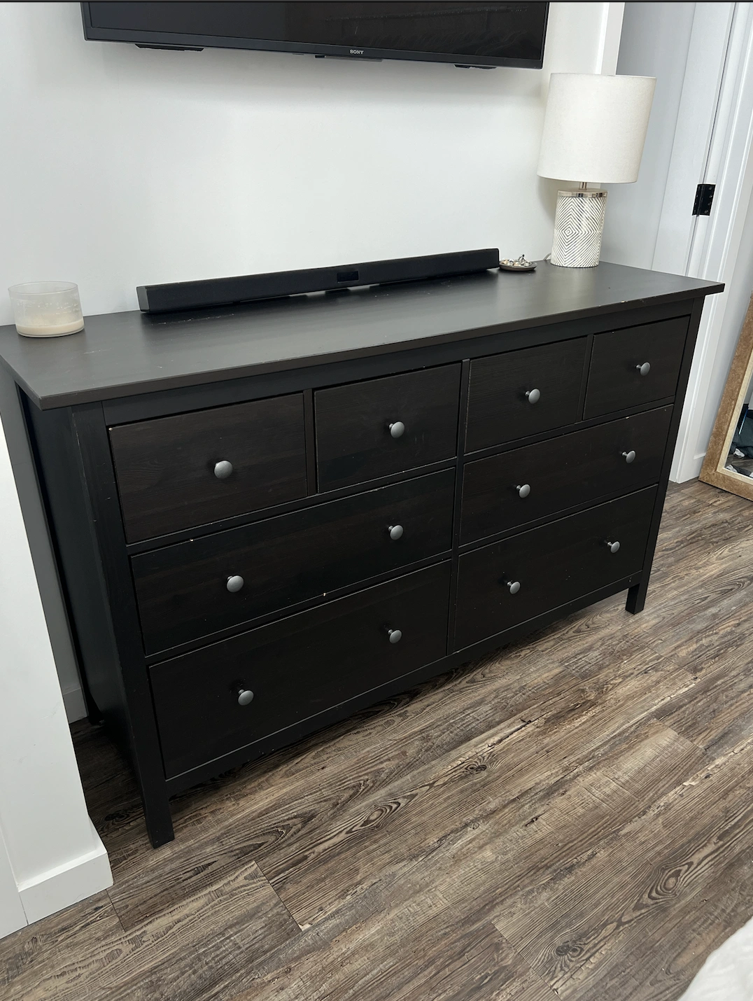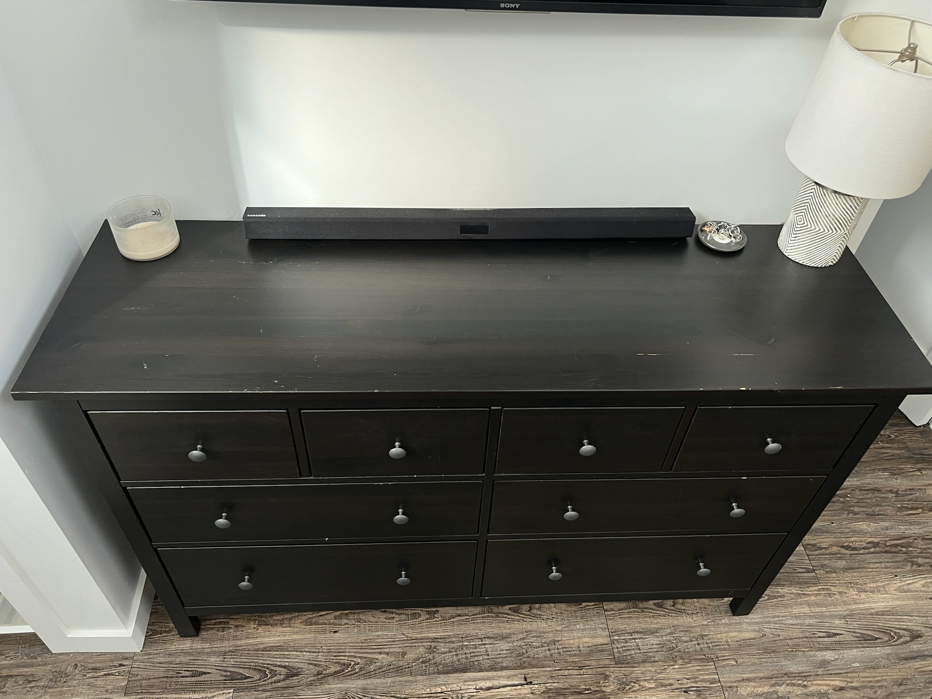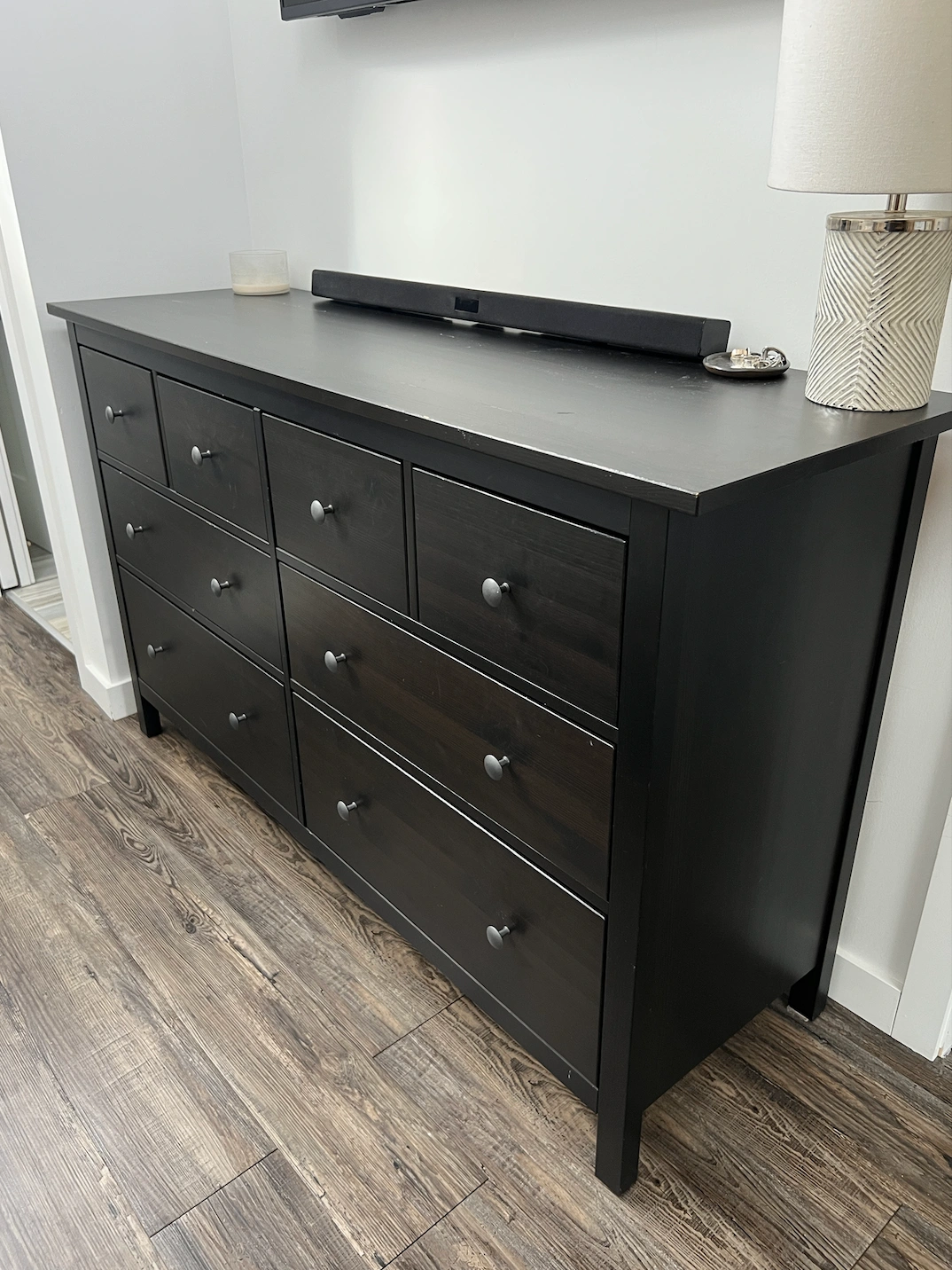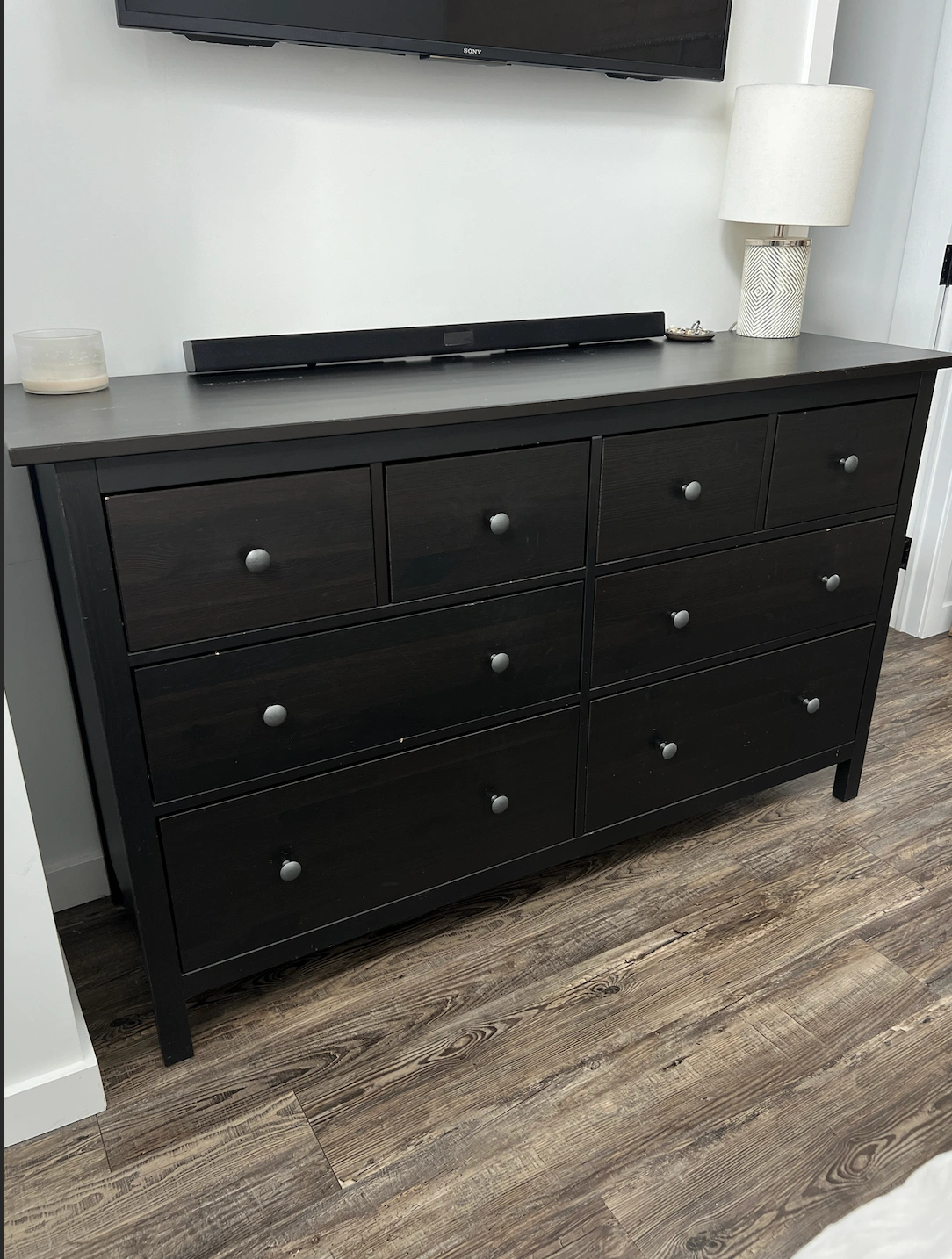 Black Ikea Hemes Dresser. A classic larger-sized chest of drawers in solid wood, with a traditional look and modern function. Quiet, smooth-running drawers make it easy to organise your things. Minor scratches. Retails new for $599. Open to offers