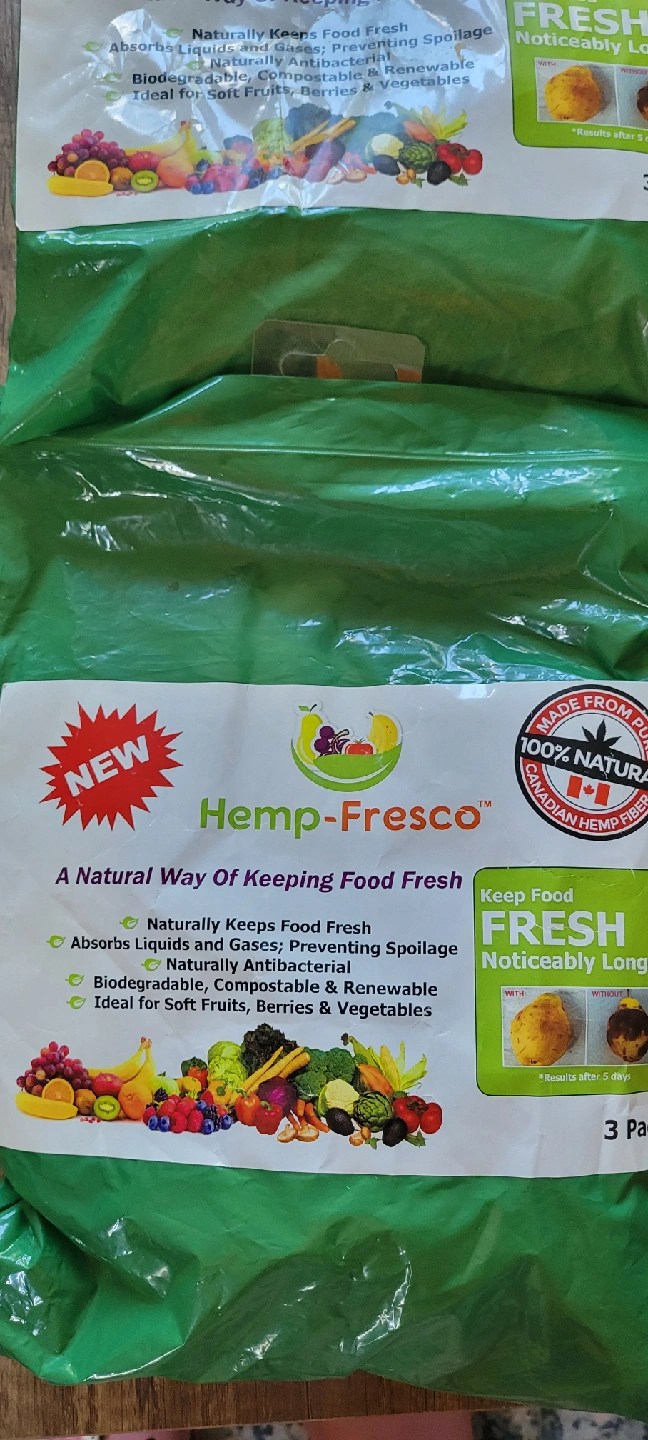 I'm selling Hemp-Fresco pads, a natural way of keeping food fresh! These pads naturally keep food fresh, absorb liquids and gases, preventing spoilage. They're biodegradable, compostable, and renewable, making them ideal for soft fruits, berries, and vegetables! Each package contains 3 pads. I used 1, so 5 left.