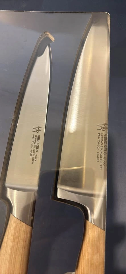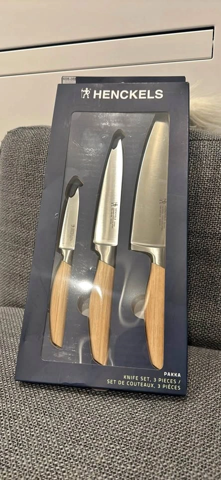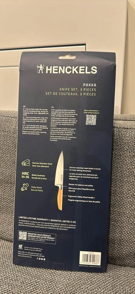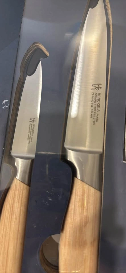 🔪 Henckels Pakka 3-Piece Knife Set – Nature Collection. Brand new, factory sealed — never used. This elegant set from Henckels’ Pakka collection features beautifully crafted Pakka wood handles and high-quality German stainless steel blades. Included Knives: • 20 cm Chef’s Knife • 16 cm Carving / Utility Knife • 9 cm Paring Knife Key Features: • Premium Pakka wood handles for grip, durability & aesthetics • Full-tang construction for stability • Razor-sharp stainless steel blades • Balanced, ergonomic feel • Ideal both for everyday use or as a gift Retail Reference: This same set is sold at $119.99 CAD in Canada (Best Buy) in new condition. 📍 Pickup at 16th & Kingsway (Burnaby).