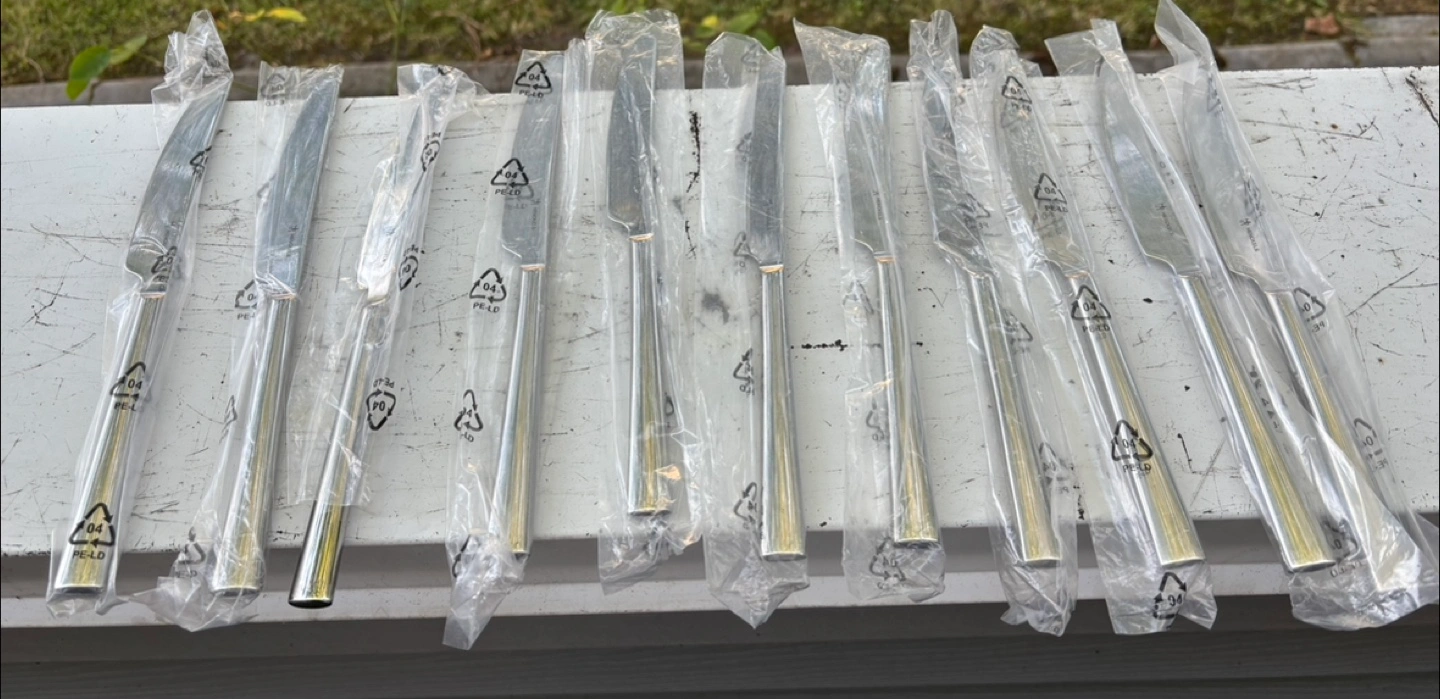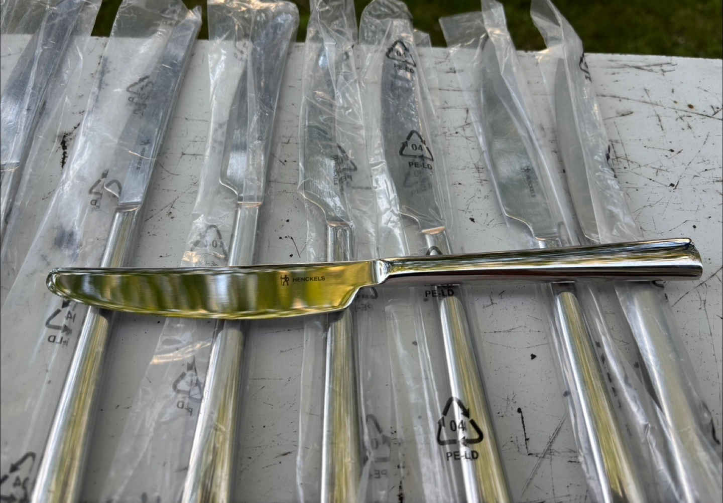 Silverware with shiny blades and long, slender handles. They still have their original packaging. These knives can be used to make meal times more enjoyable. 11 x brand new Henckels knives $70 for all Pick them up near Richmond Centre