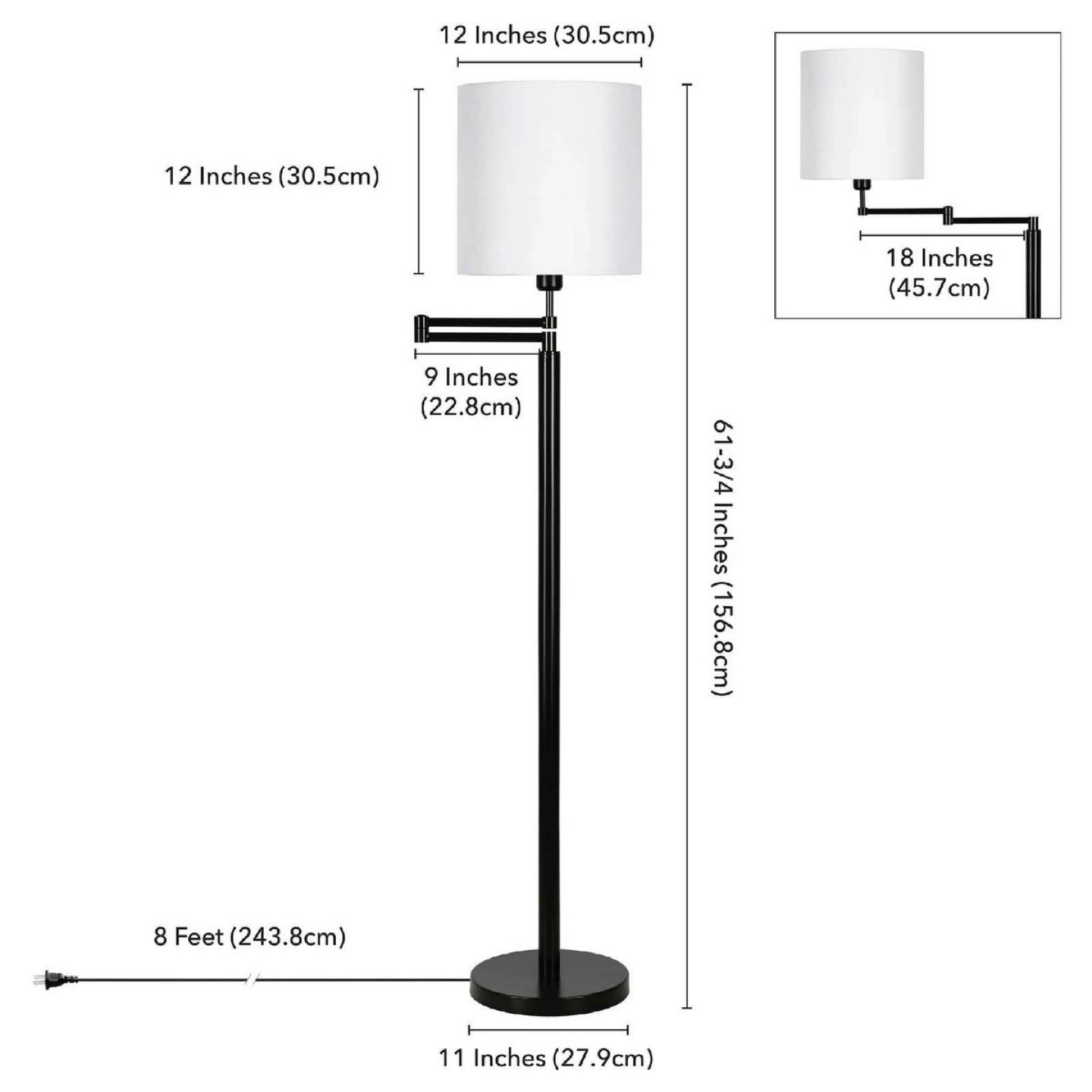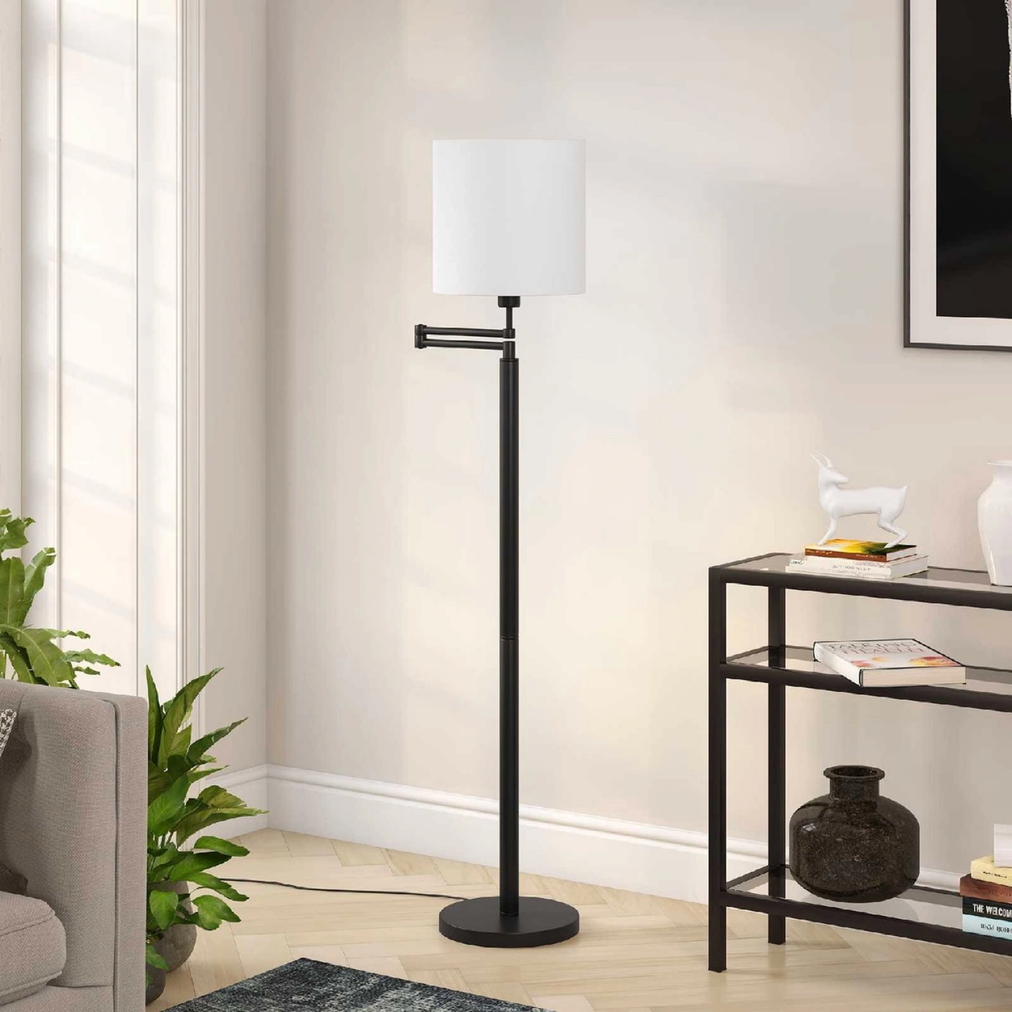 Henn&Hart 23″ Blackened Bronze Metal/Fabric Floor Lamp This clean, chic, linear lamp is modern in design and will fit into many contemporary spaces. It takes it’s inspiration from mid-century modern design. . A minimalist architectural design in blackened bronze or brass and includes a simple fabric white linen shade. A perfect choice next to your favorite reading chair or sofa, this floor lamp will easily become the focal point in any room such as the living room, bedroom, or home office.Features : Handcrafted in a blackened bronze metal. Featuring a round shaped shade. The fabric shade measures a diameter of 12″ by 12″ H. Includes an 8ft cord. Premium materials have been used in the making of this product Specifications : Product Weight : 18.0 lbs Target Audience : Adult (18 Years and Up) Assembly details : Adult Assembly Required, Tools Not Provided
