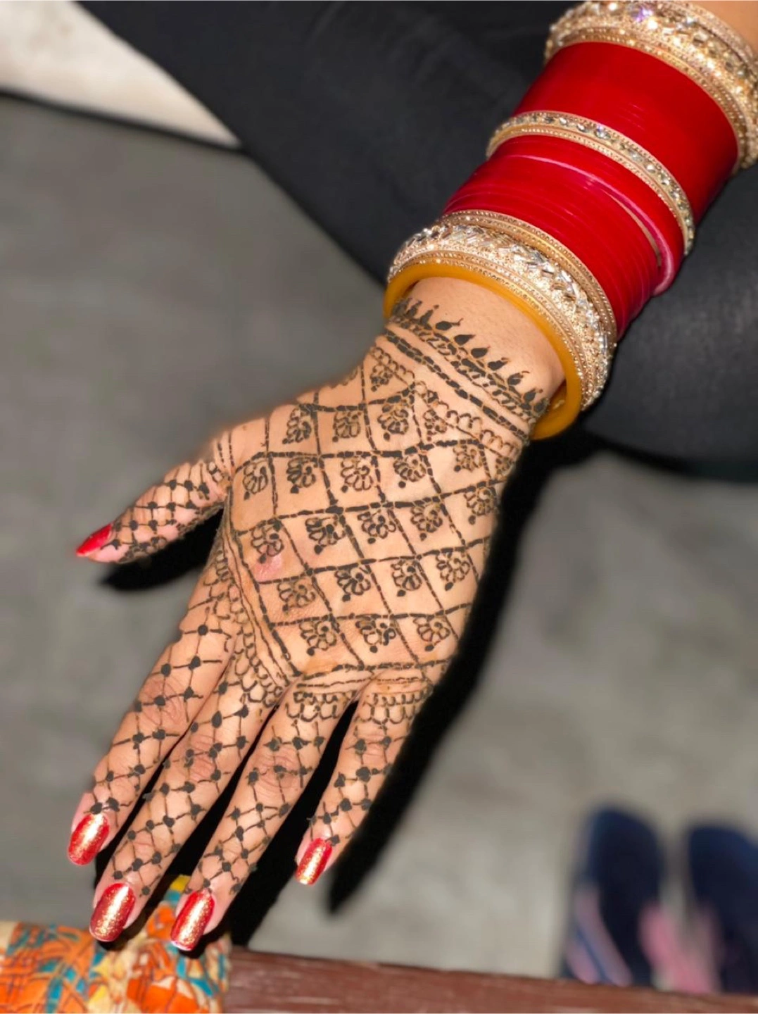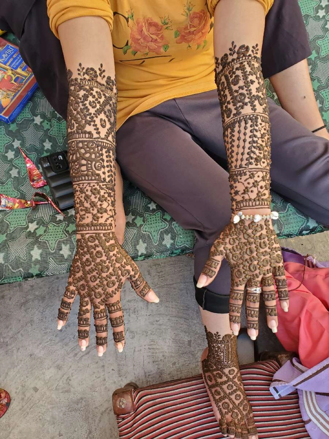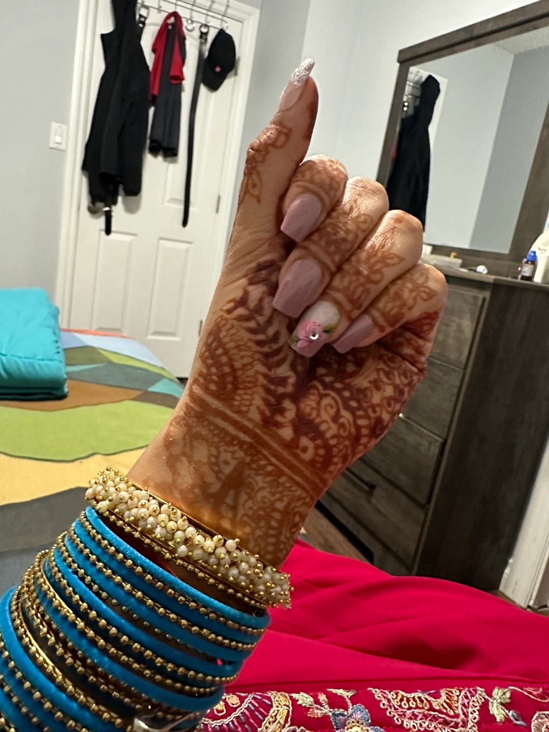 Beautiful henna tattoo design. Intricate floral and geometric patterns on the arms and hands. Perfect to bring a sense of serenity and peace to the one wearing it. Acrylic Nails for $20-25