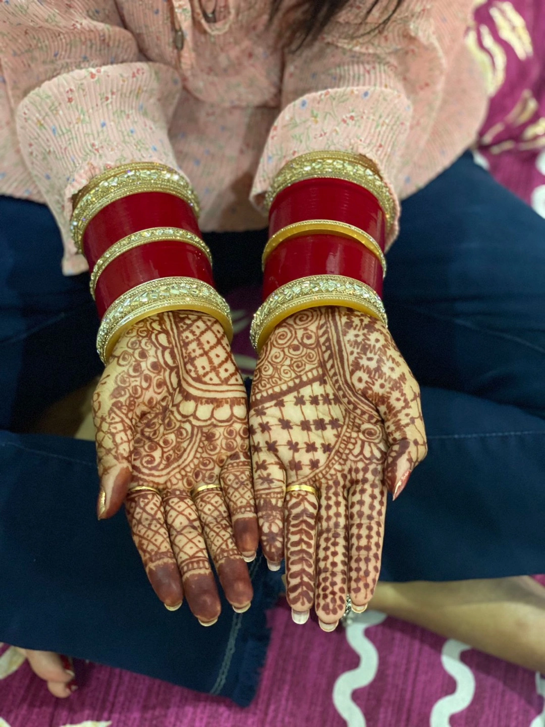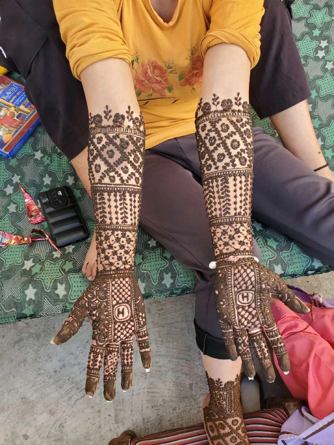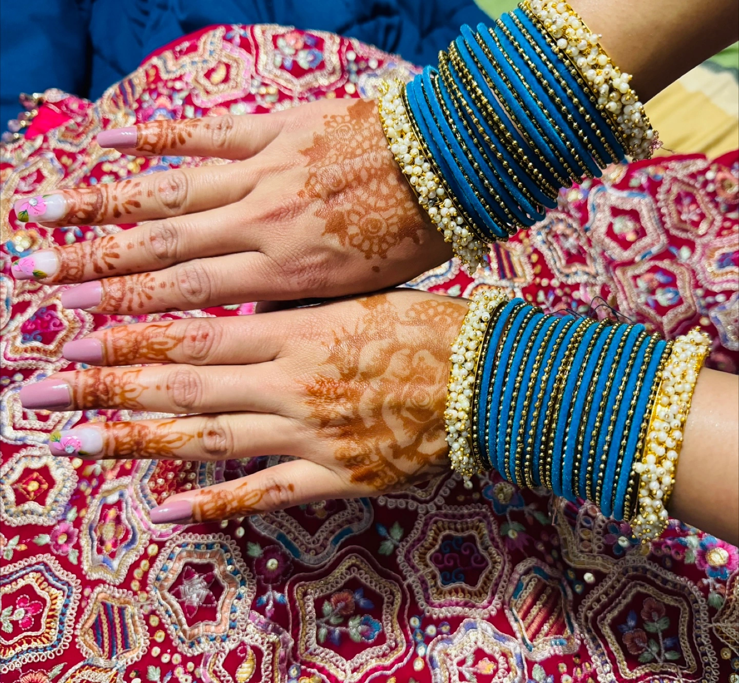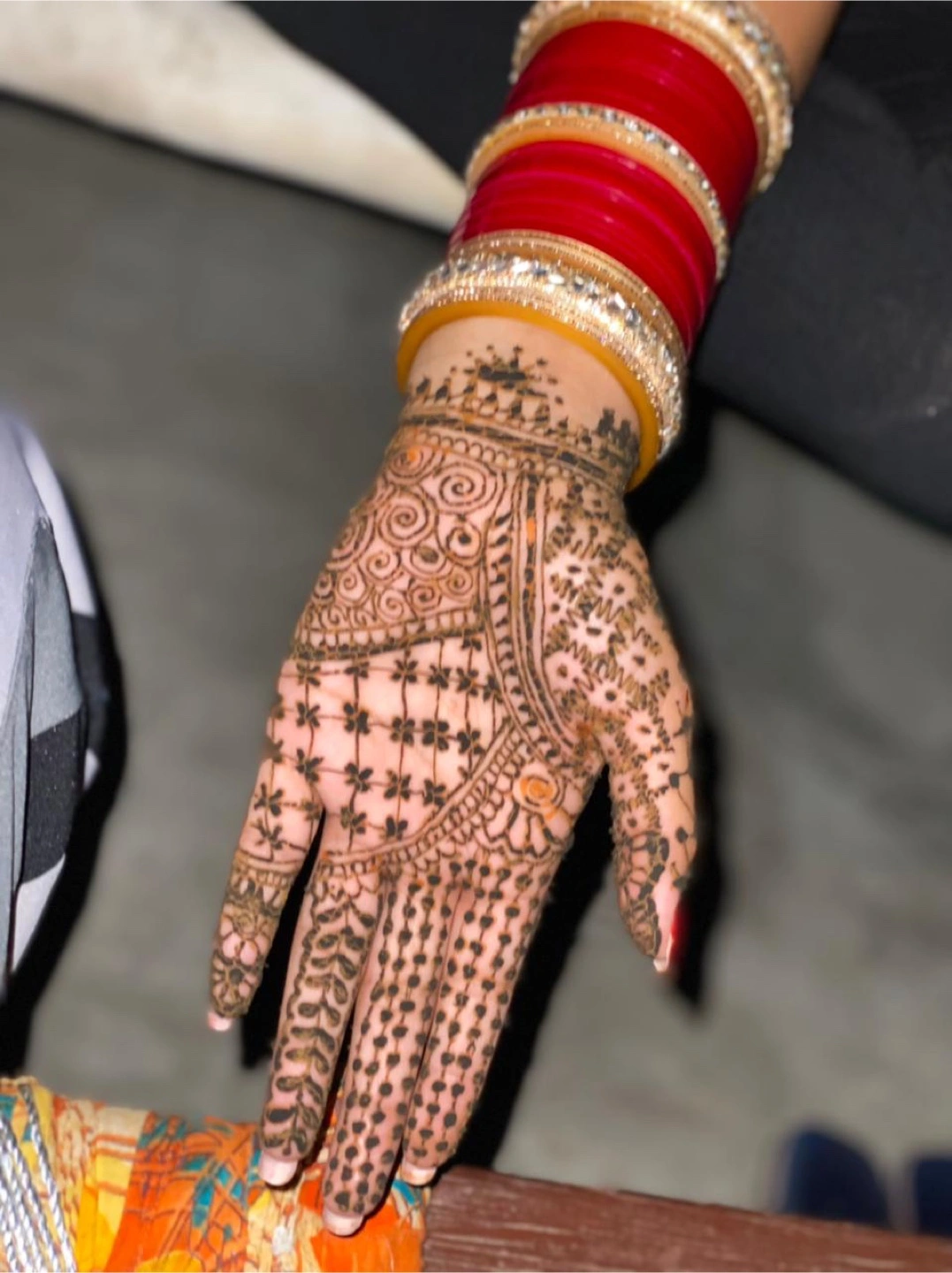 Beautiful henna tattoo design. Intricate floral and geometric patterns on the arms and hands. Perfect to bring a sense of serenity and peace to the one wearing it. Acrylic Nails for $20-25