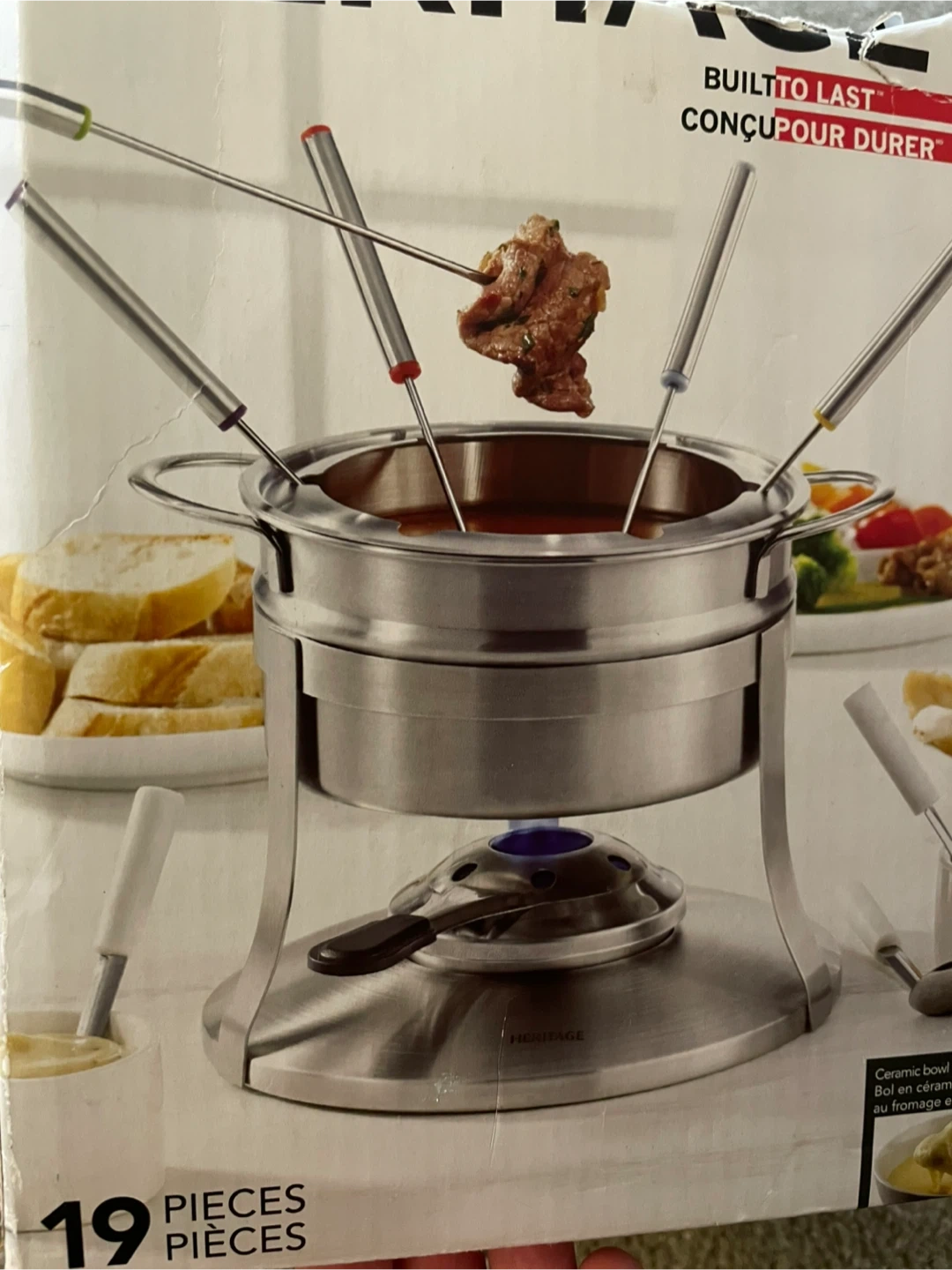 Selling a brand new Heritage 19-piece fondue set! This set is built to last and includes everything you need for a fun fondue night. Perfect for cheese, chocolate, or meat fondue! Cash only